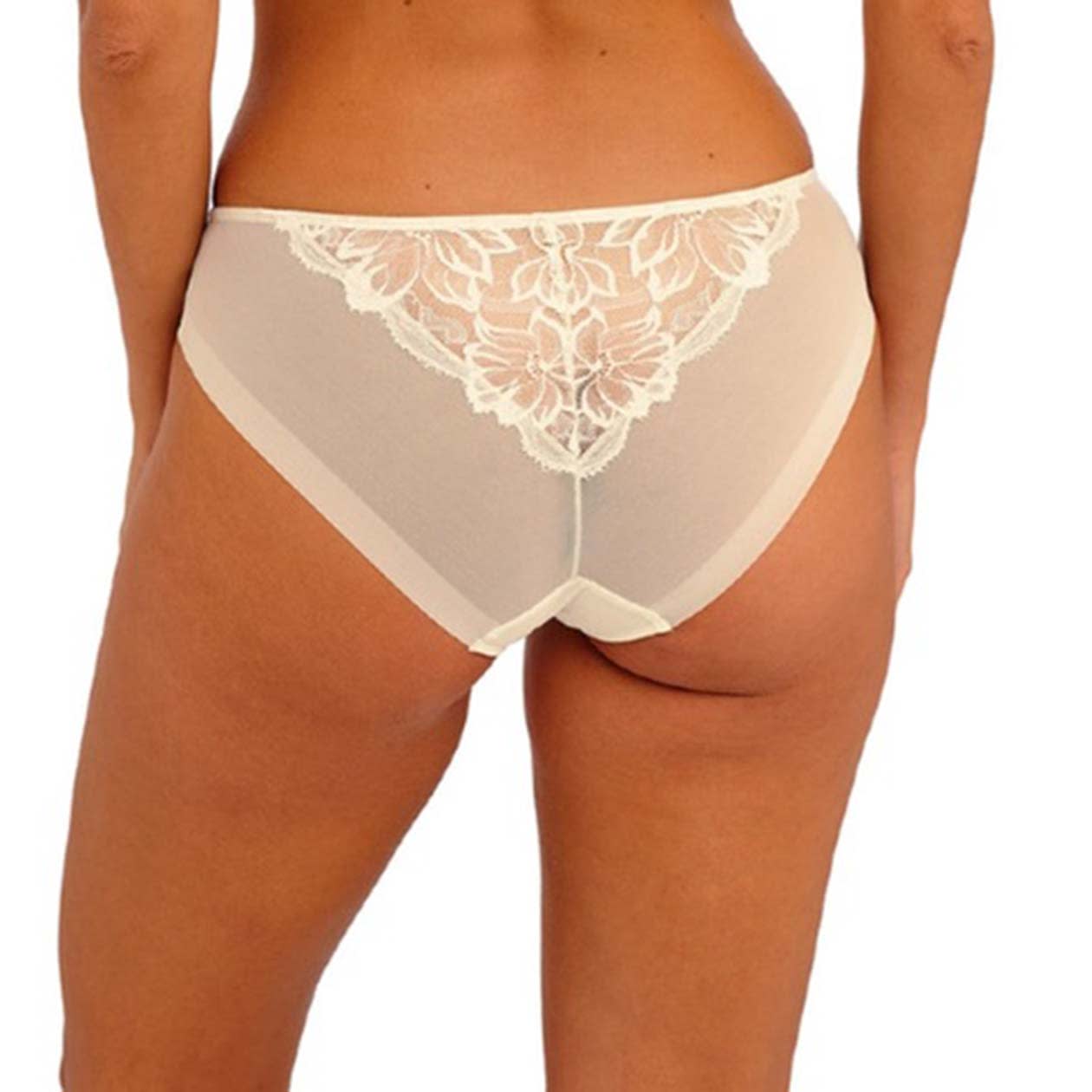 The Abellia Brief offers a flattering fit with its mid-rise waist and medium back coverage. It features scallop stretch lace overlaid onto stretch mesh at the front and back for a beautiful look. The ultra-smooth selvedge mesh at the back legs ensures a no-show, no visible pant line finish. With plain plush elastic at the waist and front legs for a tailored feel, this brief is completed with a delicate pearl drop effect trim at the center front.
