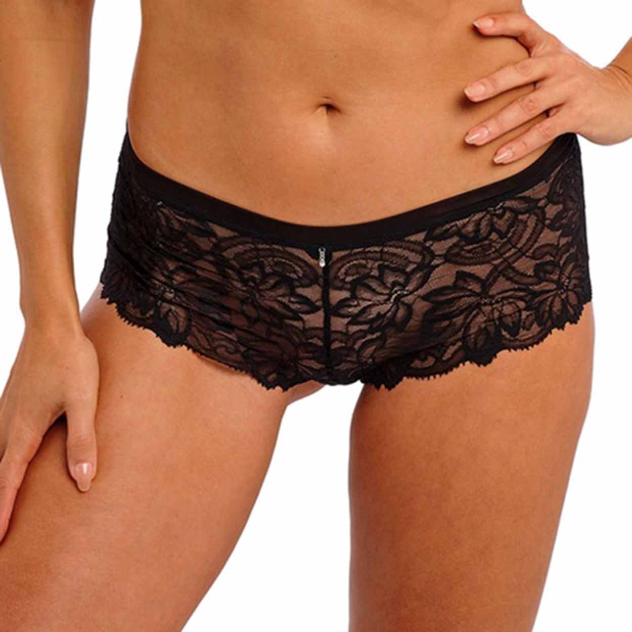 The Abellia Short is a comfortable and cheeky style with a mid-rise waist and cheeky back coverage. It's a full stretch lace short with beautiful scallop detail at the leg edges. A folded stretch mesh waistband ensures comfort, and a delicate pearl drop effect trim at the center front adds a final elegant touch.