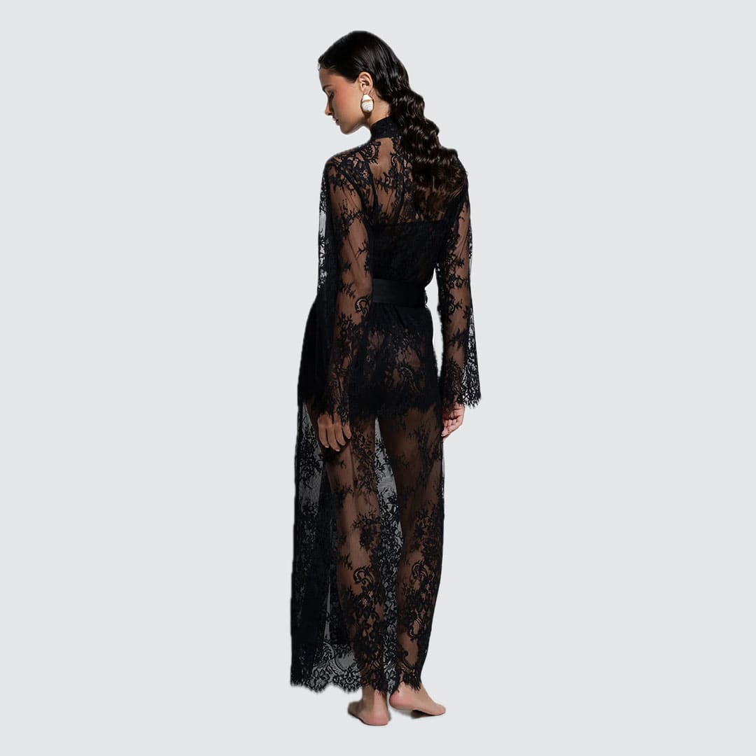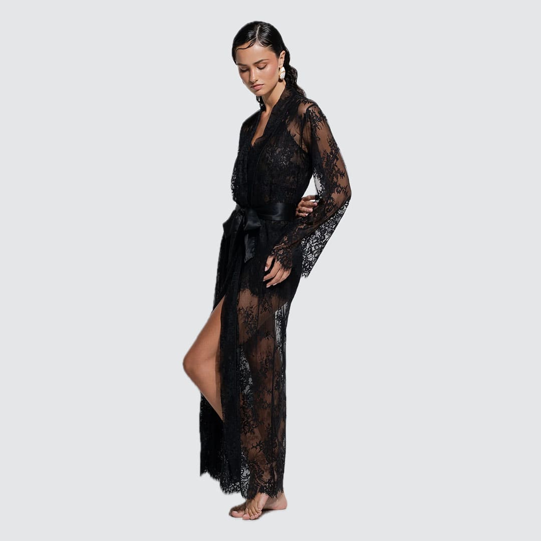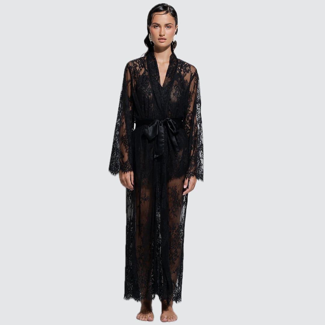 Ethereally romantic, the Aurielle Robe is the essence of sheer sophistication. Crafted from exquisite floral lace, its flowing maxi-length silhouette drapes effortlessly over the body. A satin sash tie softly defines the waist, complemented by sleek satin piping for a refined touch. Scalloped lace trims at the sleeves and hem add a whisper of femininity — perfect layered over your favourite sleepwear or worn alone for a truly indulgent moment.
