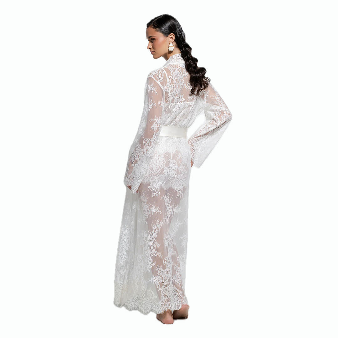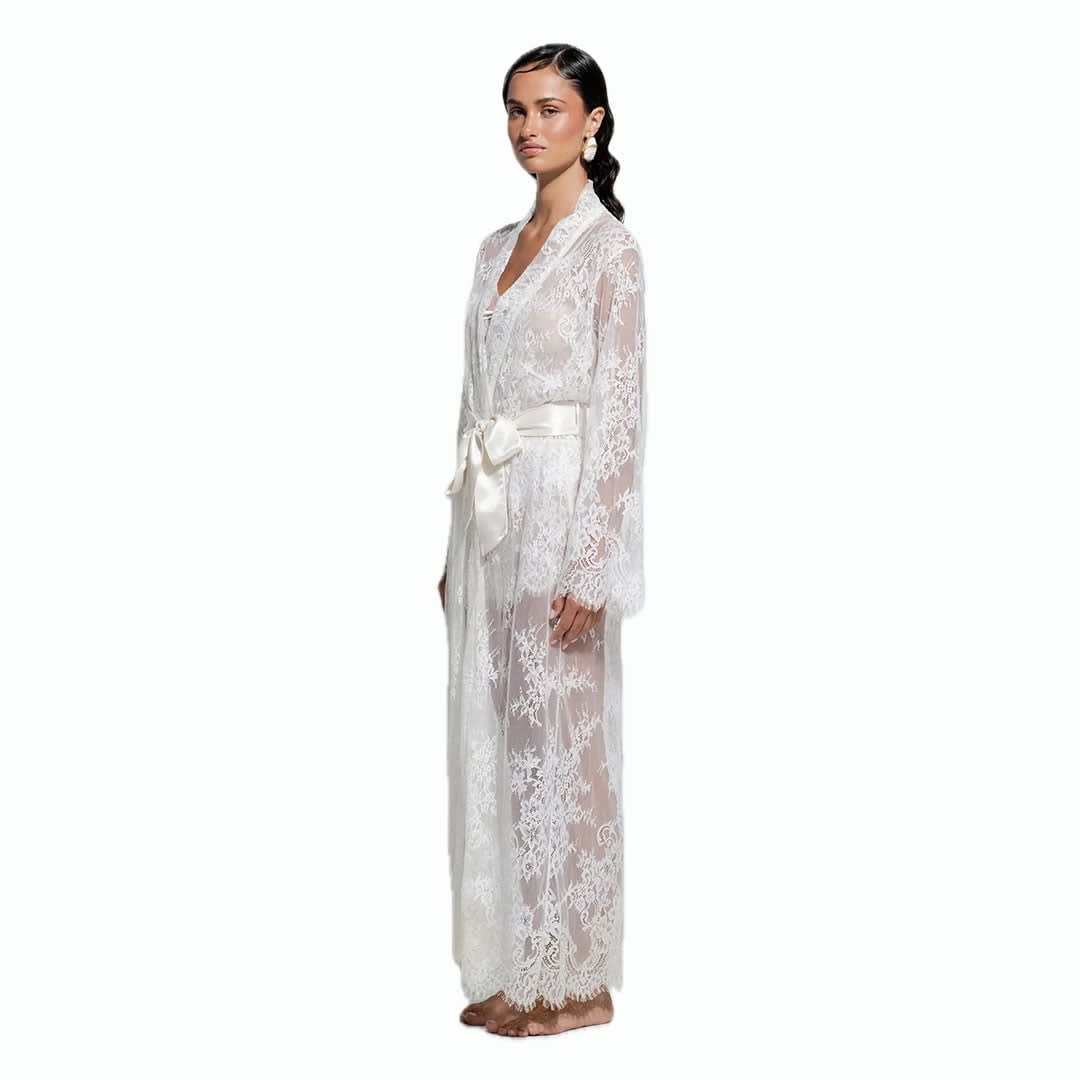 Ethereally romantic, the Aurielle Robe is the essence of sheer sophistication. Crafted from exquisite floral lace, its flowing maxi-length silhouette drapes effortlessly over the body. A satin sash tie softly defines the waist, complemented by sleek satin piping for a refined touch. Scalloped lace trims at the sleeves and hem add a whisper of femininity — perfect layered over your favourite sleepwear or worn alone for a truly indulgent moment.