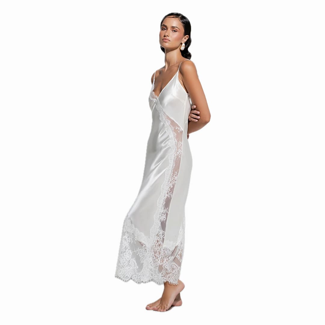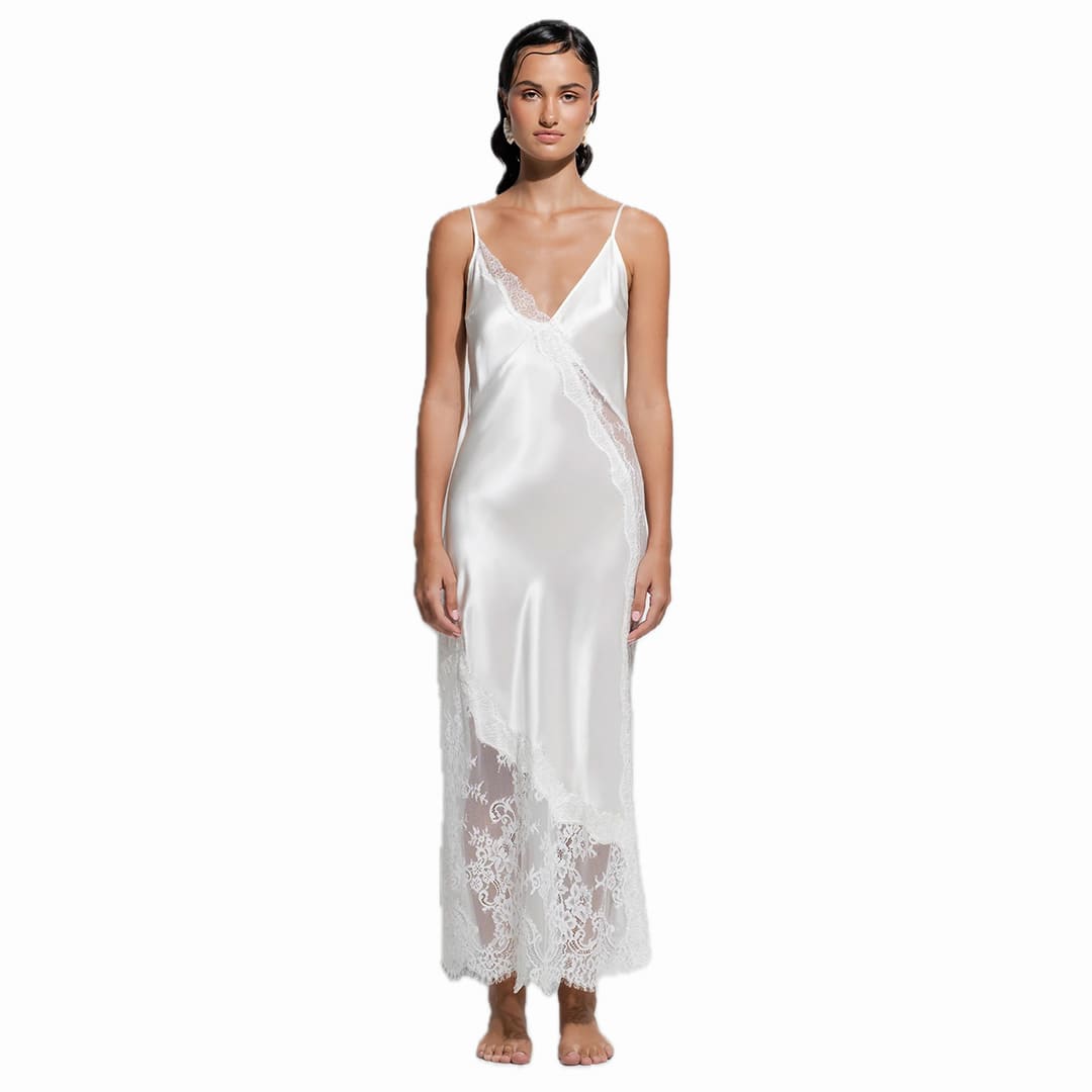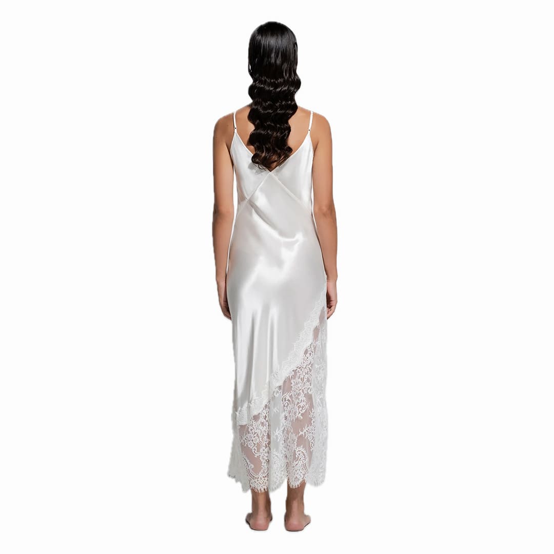 The Aurielle Slip is made from a luxurious silk–cotton blend, offering an effortlessly light and silky feel against the skin. Designed in a flattering midi length that gently skims the mid-calf, it’s accented with asymmetrical lace detailing for a romantic, modern touch. Finished with delicate scalloped lace along the hem, the Aurielle combines timeless femininity with contemporary ease — perfect for lounging or layering.