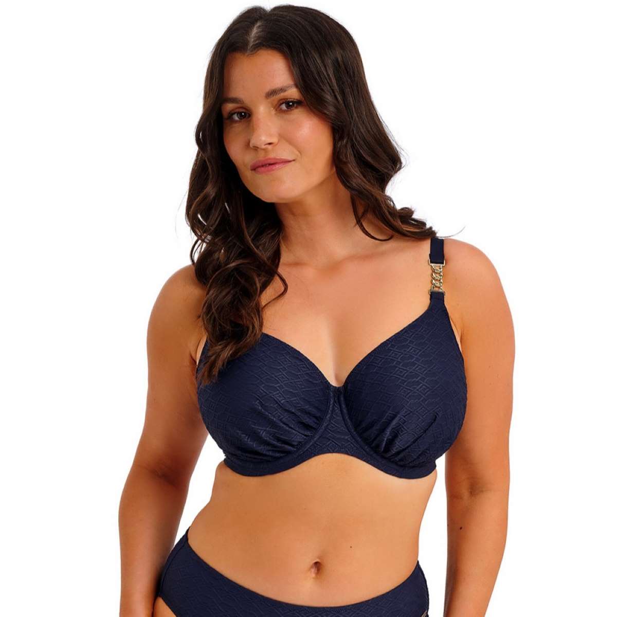 The textured knot-look design adds depth, while gold hardware details give a luxe, sophisticated finish. Gathered cups flatter all bust shapes, with fuller coverage and a concealed side sling for a forward profile. Powernet-lined wings provide support and anchorage, and fully adjustable shoulder straps ensure the perfect fit. Finished with a gold chain detail at the apex that won’t heat up in the sun.