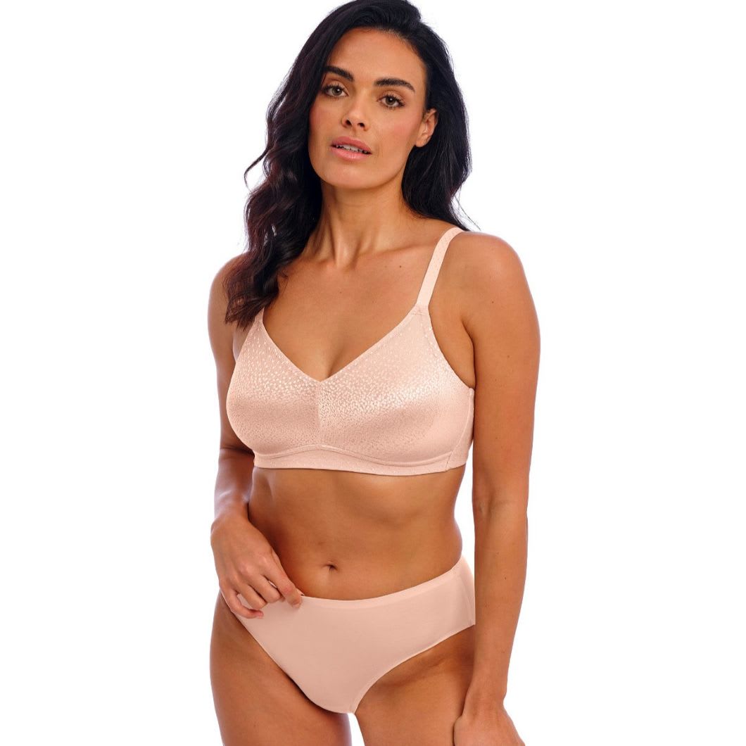 The Back Appeal Wire Free Bra is a seamless wire-free bra. It has mid-coverage two-ply cups of soft inner fabric covered with pretty dot jacquard with an accent sheen