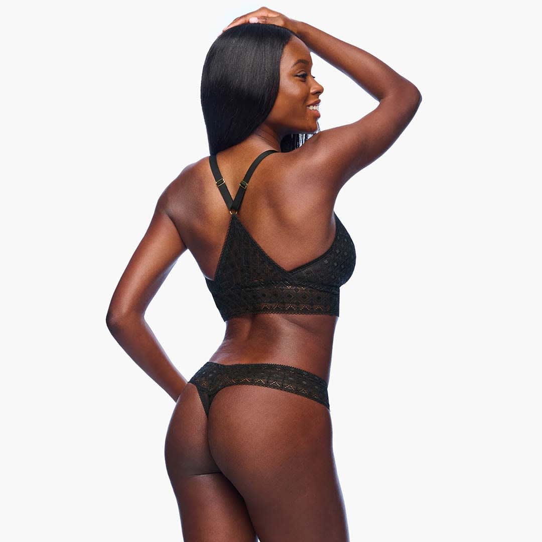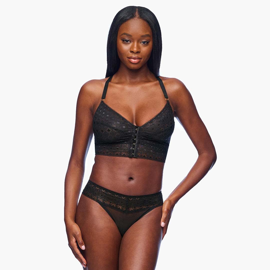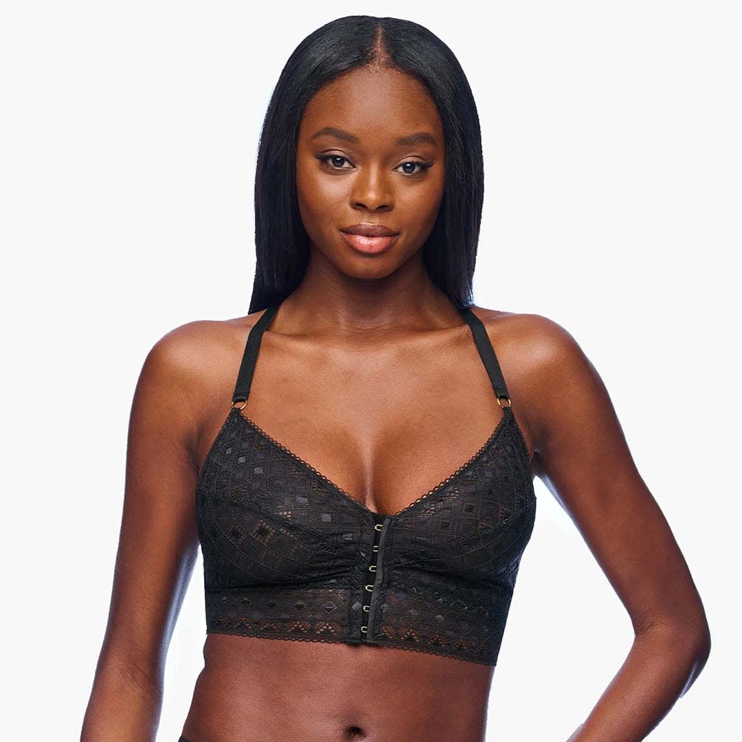 This front-closure wireless bralette is designed specifically for smaller bands with fuller cups, offering both comfort and support. The Basilica Curvy Bralette is crafted from Italian corded lace with a bold architectural pattern; it features a racerback style with power mesh lining. Adjustable wide straps and supportive side panels provide a secure, flattering fit.