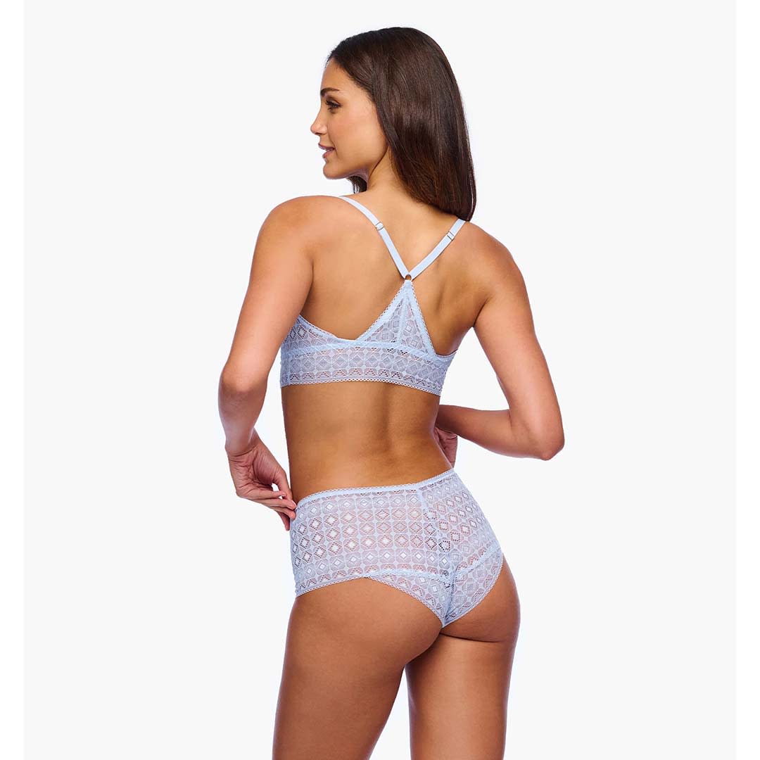This front-closure wireless bralette features Italian corded lace with a striking geometric pattern. The Basilica Plunge Bralette is designed in a racerback style with elevated lace detailing, combining both elegance and support. The adjustable straps ensure a comfortable, personalised fit.