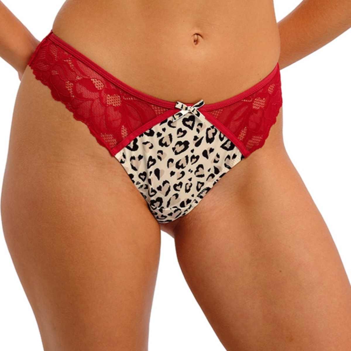 Unleash your wild side with the all-new Cherish Me Thong by Freya. Designed to turn heads, this daring style features an abstract heart-shaped leopard print at the front and centre back, perfectly paired with flirty stretch lace panels for a sexy yet comfortable fit. The contrast binding on the front seams adds a bold finish, while the printed leopard bow detail at the front brings a playful touch. Confidence starts underneath — feel fierce and empowered in Cherish Me.