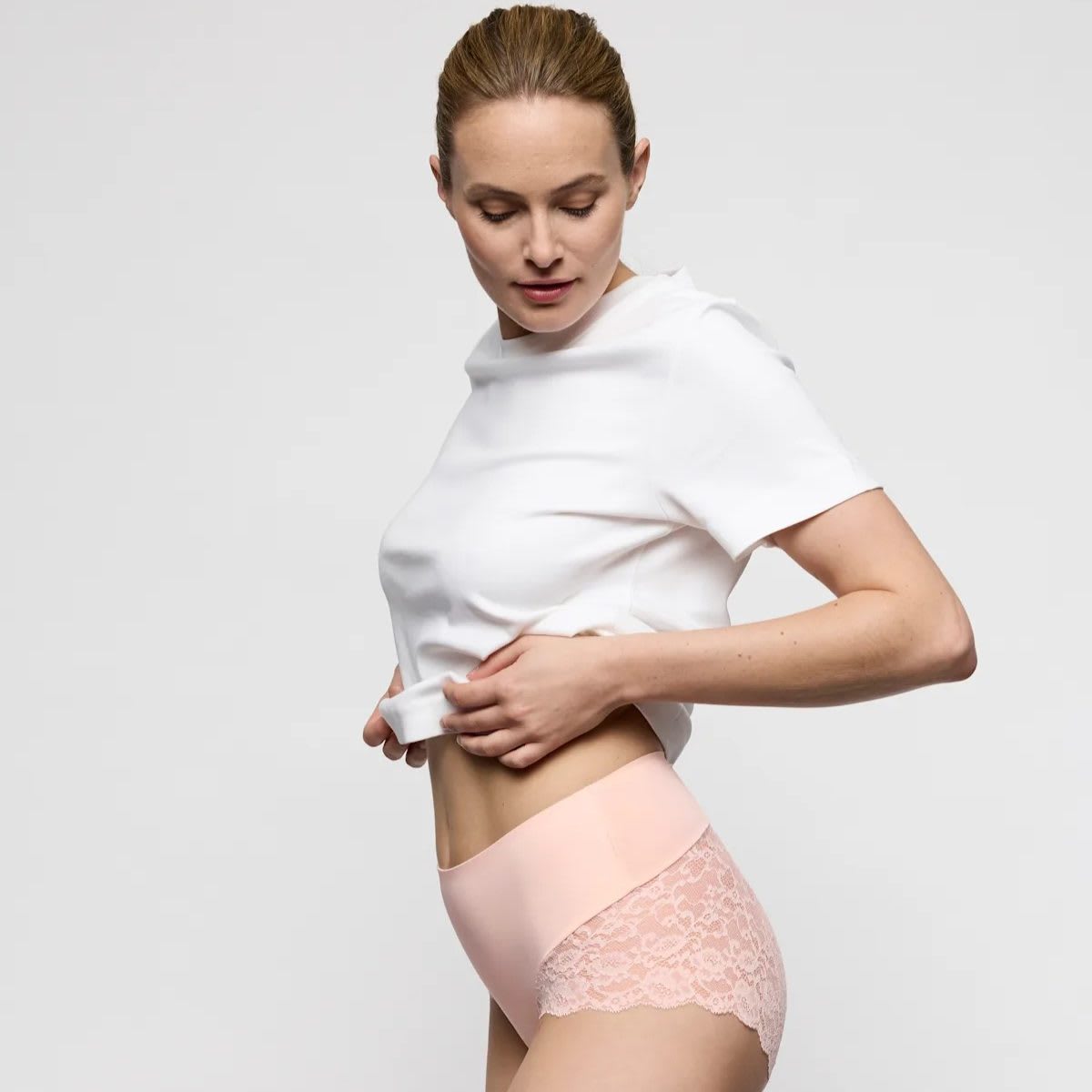 The Color Studio Lace Shapewear Briefs from Marie Jo offer full and complete coverage with a pretty, flat lace that is dense enough to create a semi opaque effect at the back. Smooth with no VPL.