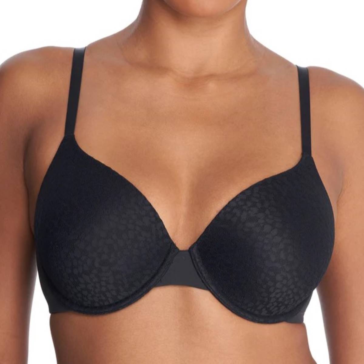 xperience next-level comfort with this full coverage T-shirt bra, designed to create a smooth, invisible finish under clothing. Seamless cups offer complete support, while ultra-thin memory foam pads adapt to your shape for a lightweight, custom fit. Soft fabric is paired with modern stretch lace featuring a subtle geo-animal print for a stylish touch. Adjustable straps can be worn regular or criss-cross, and the wide 2-ply back smooths for a flattering silhouette. Finished with a tag-free design for all-day comfort.