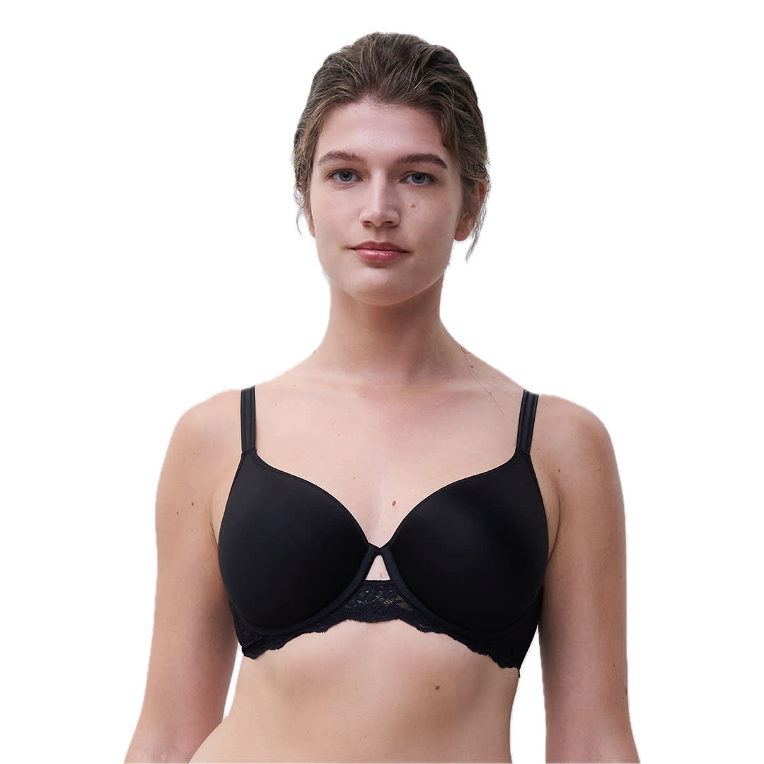 The Crush Covering Memory Bra features adaptive memory foam padding that moulds to your shape, combining opaque knit with floral lace for a refined look. It has fully adjustable textured straps, a straight elastic-tulle back, is OEKO-TEX® Standard 100 certified, and is designed in France.