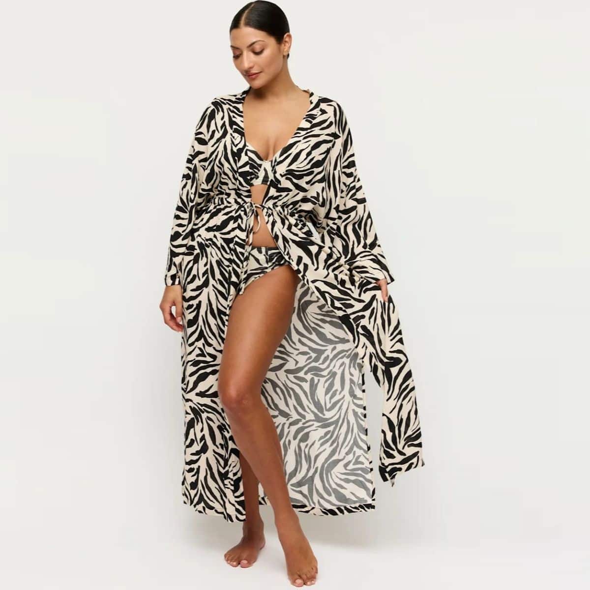 Poolside glam was never this comfy. Pure luxury! Airy kimono with a high slit and flowing bell sleeves. Cool print with a glitter effect.
