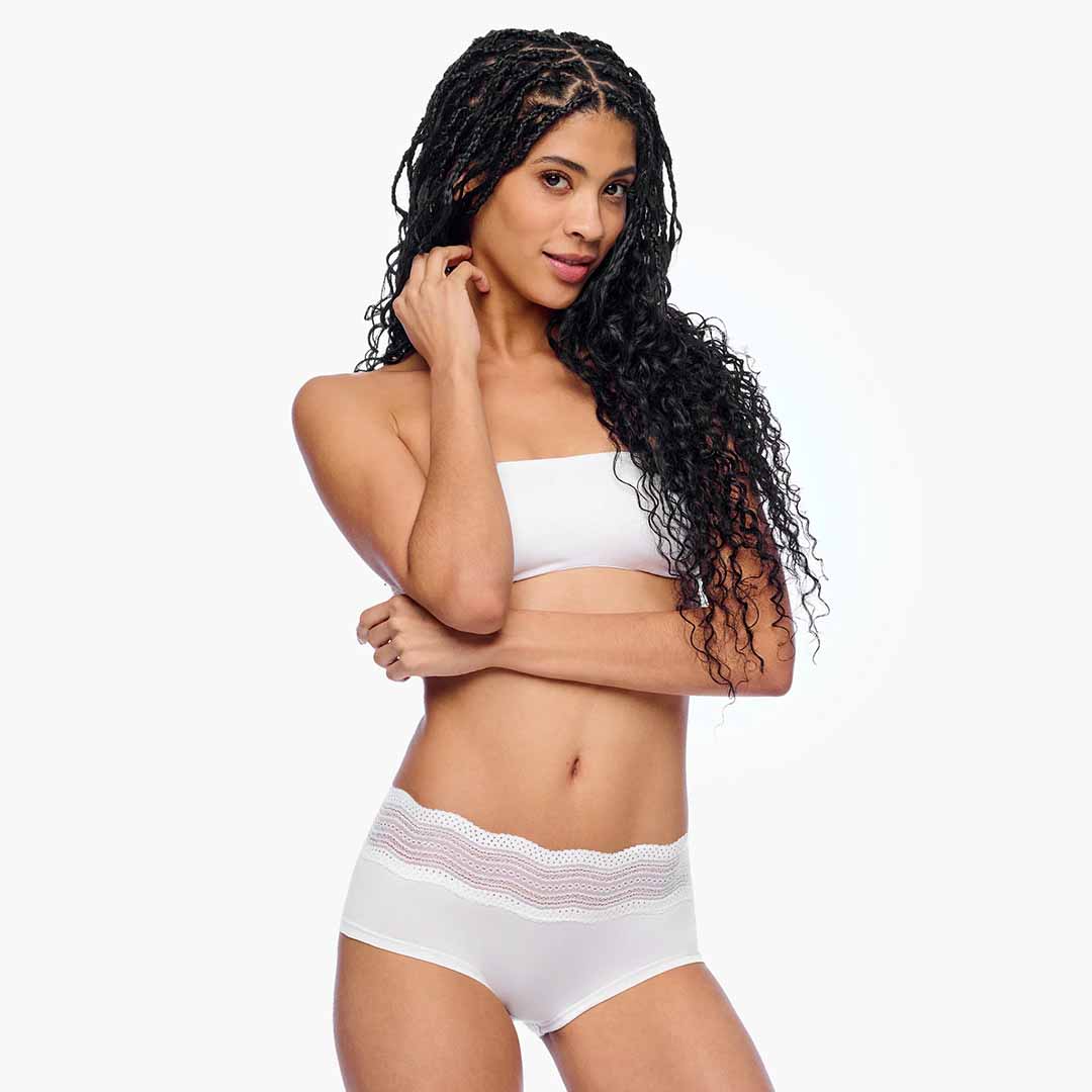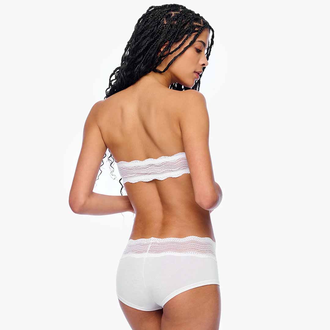 Mid-rise boyshorts crafted from ultra-soft cotton and delicate chevron lace. Dolce Boyshort features a semi-sheer, stretchy lace waistband for a comfortable fit and full rear coverage. Finished with a cotton-lined gusset for added comfort.