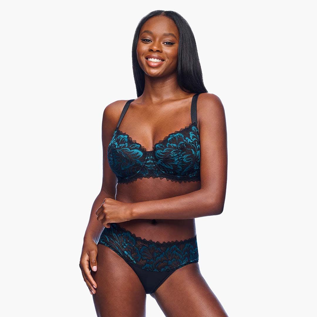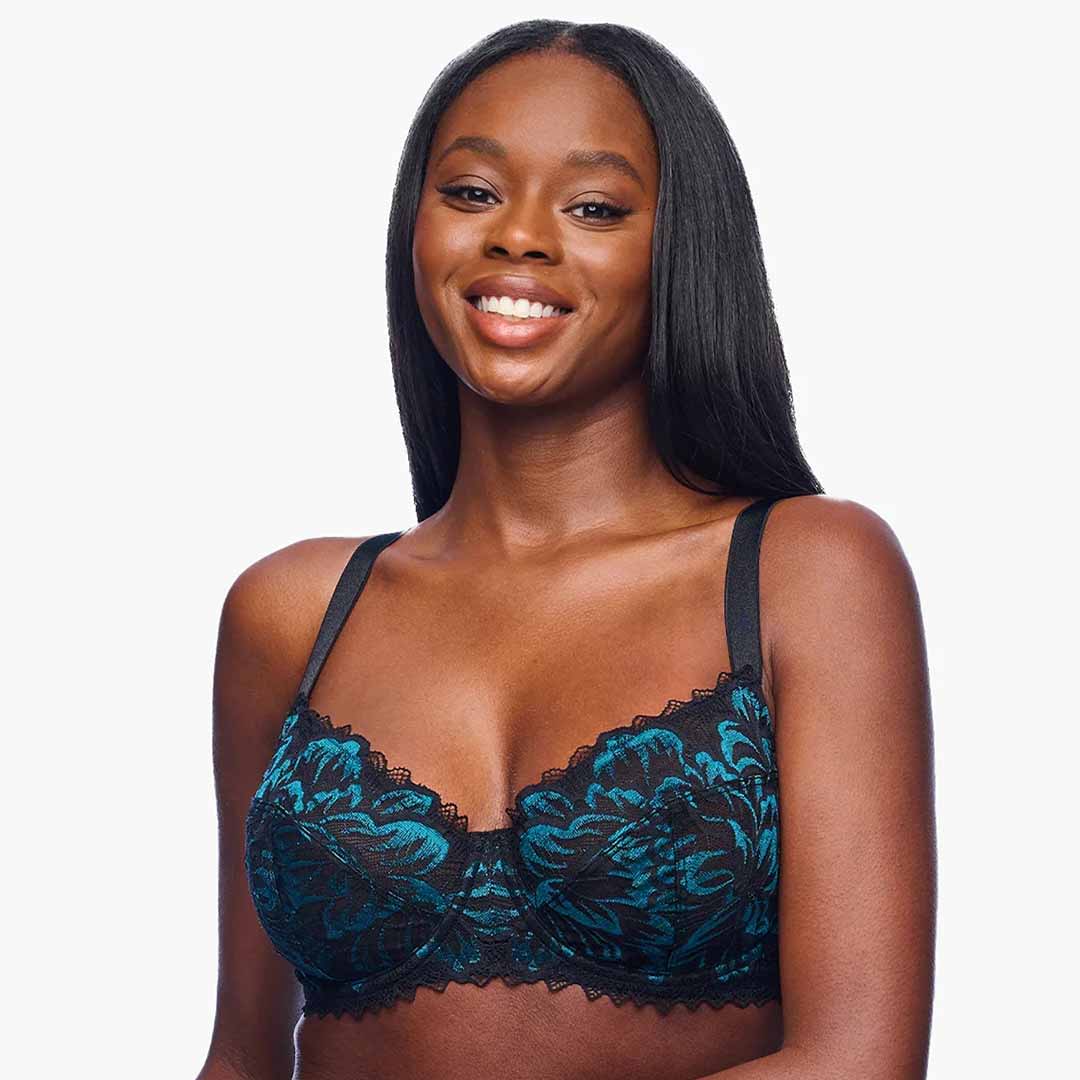 The Encantata Full Cup Bra is an elegant, unlined underwire bra featuring a side-support design with three-panel construction for enhanced forward shaping. Crafted from two-tone Italian lace with subtle shimmer embroidery for a touch of luxury. Finished with adjustable straps and a hook-and-eye closure. Hand wash in cold water and hang to dry.