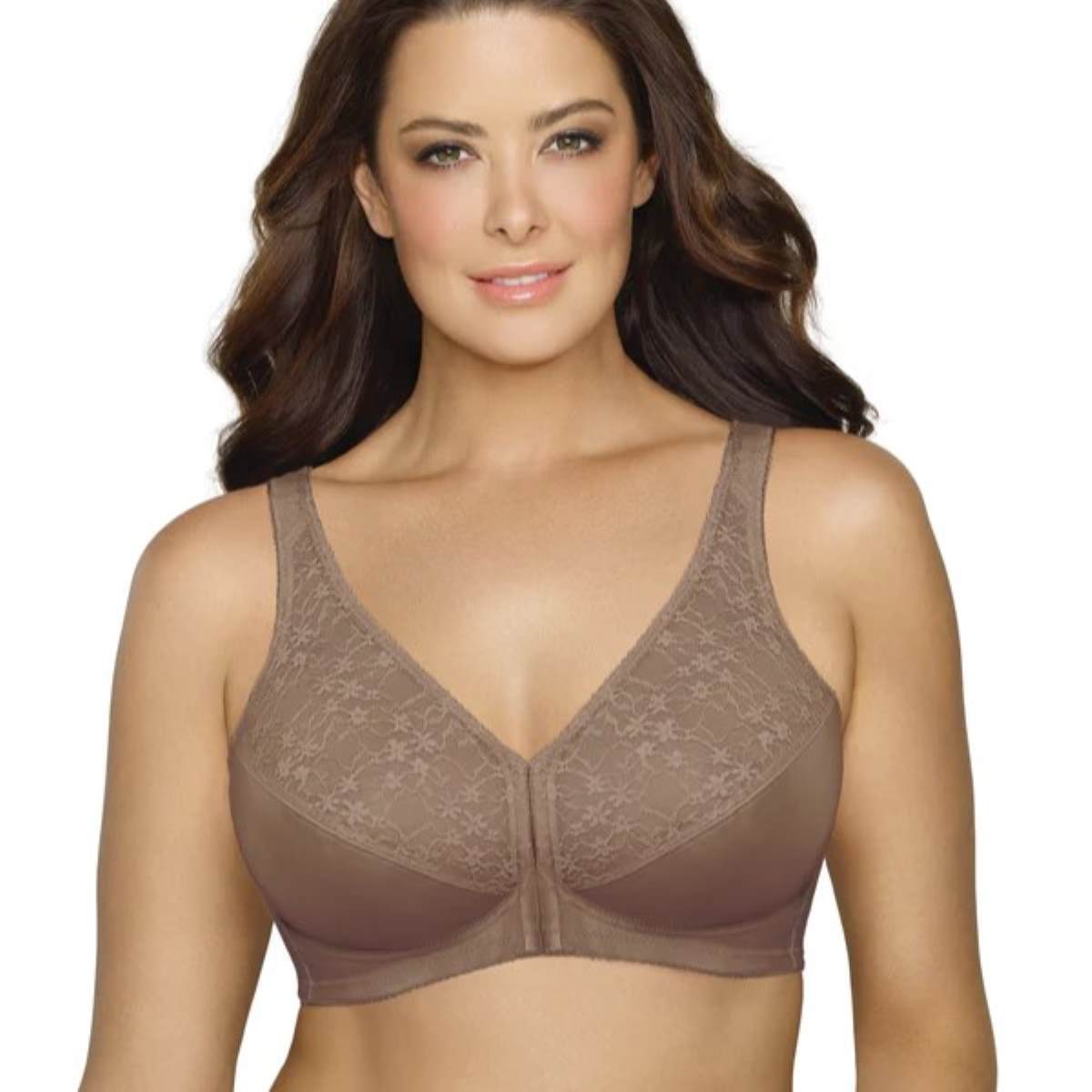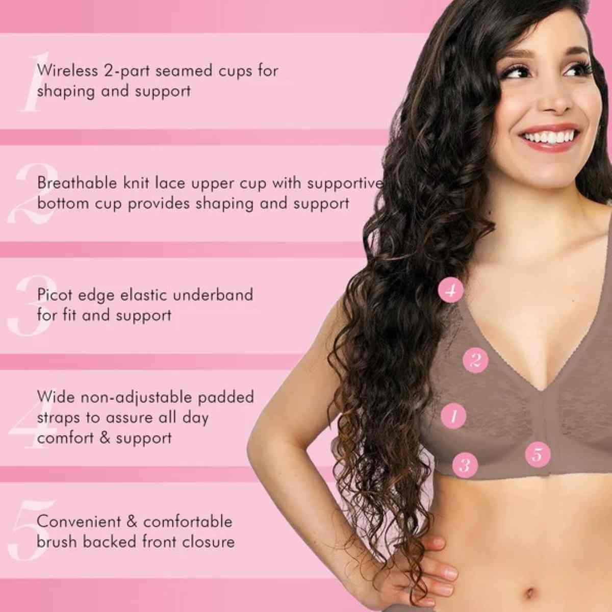 The Front Close Posture Lace Wirefree Bra is the perfect way to enjoy better bust support and a straighter back. It's a front closure bra with hook-and-eyes between the cups, which are wire free and made from a sturdy, supportive fabric on the lower half and a breathable sheer lace on the upper section. This posture-improving bra has an extra-tall back with criss-cross elastic, which has the added benefit of creating a smooth line under your clothing and is finished with padded straps for added comfort.