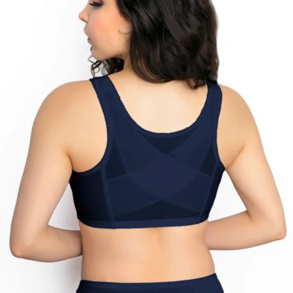 The Front Close Posture Lace Wirefree Bra is the perfect way to enjoy better bust support and a straighter back. It's a front closure bra with hook-and-eyes between the cups, which are wire free and made from a sturdy, supportive fabric on the lower half and a breathable sheer lace on the upper section. This posture-improving bra has an extra-tall back with criss-cross elastic, which has the added benefit of creating a smooth line under your clothing and is finished with padded straps for added comfort.