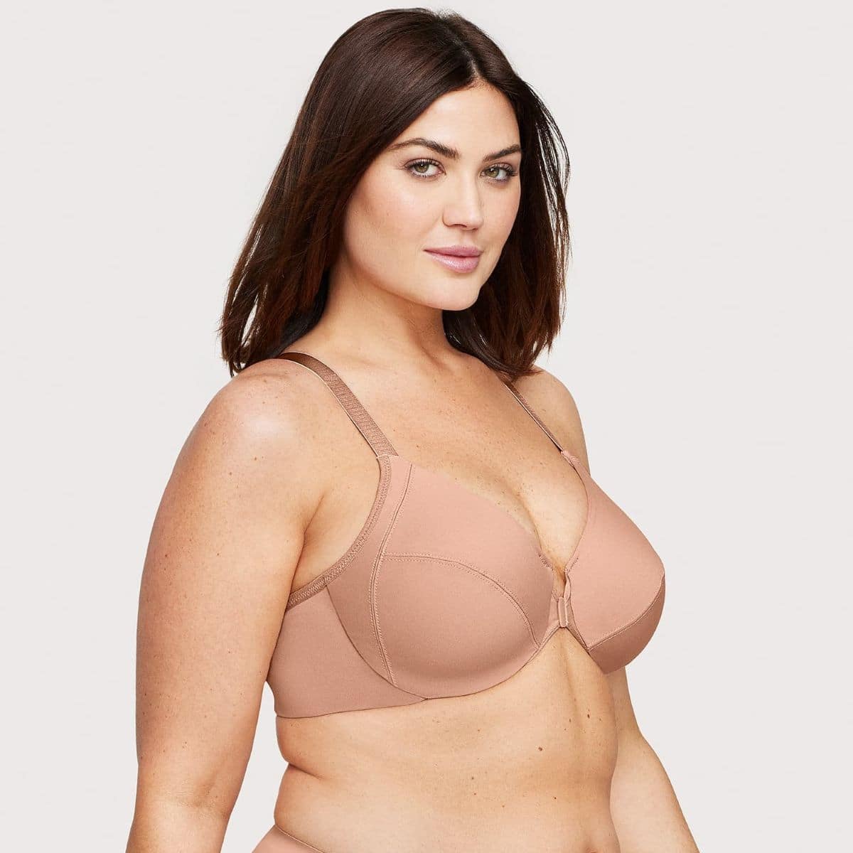 Smoothing high back with stretch fit. Non-slip straps adjust to your fit. Easy on and off secure front closure.