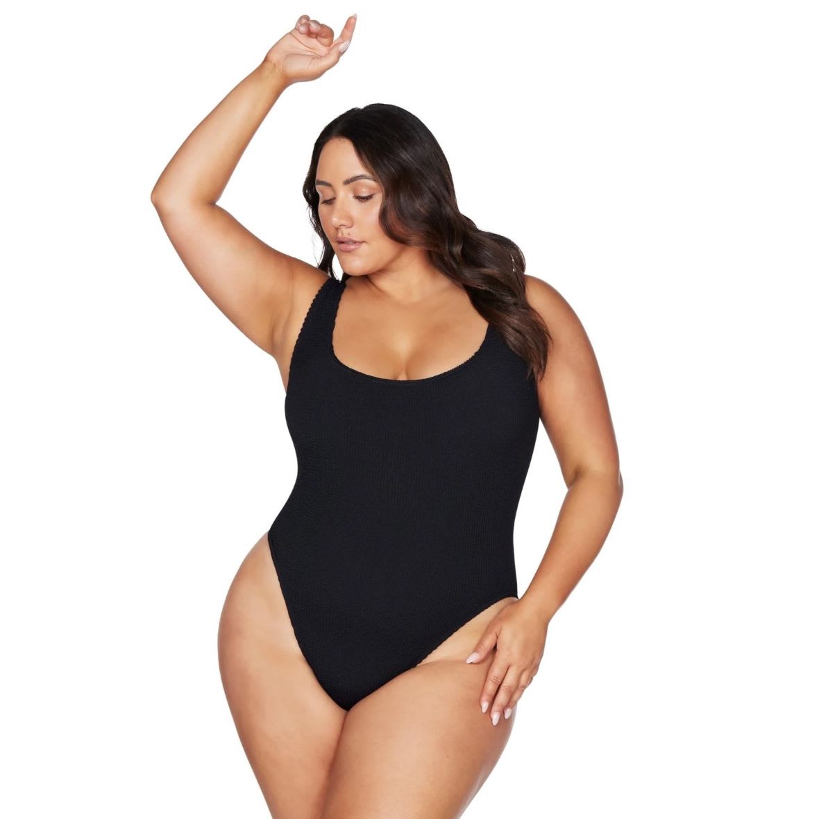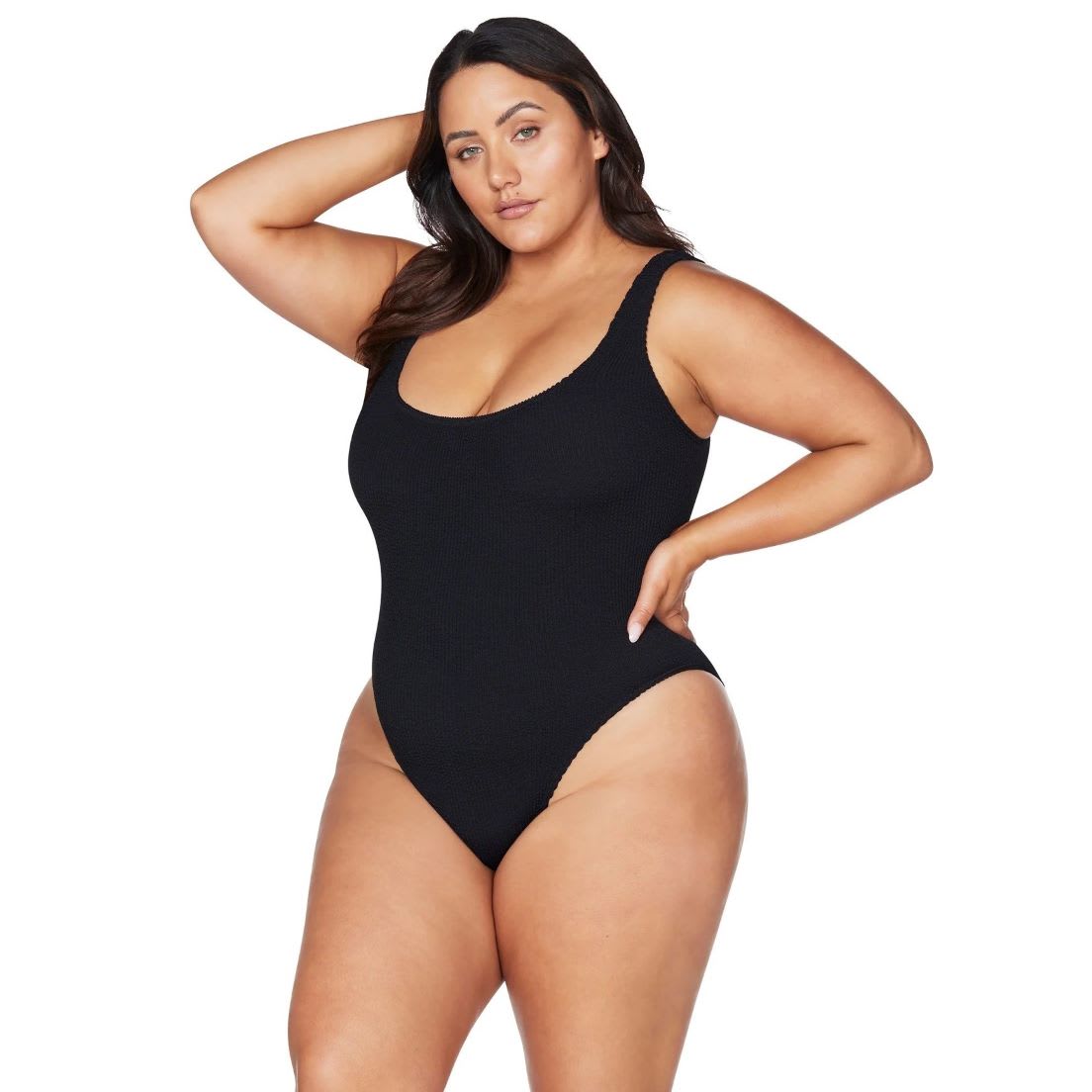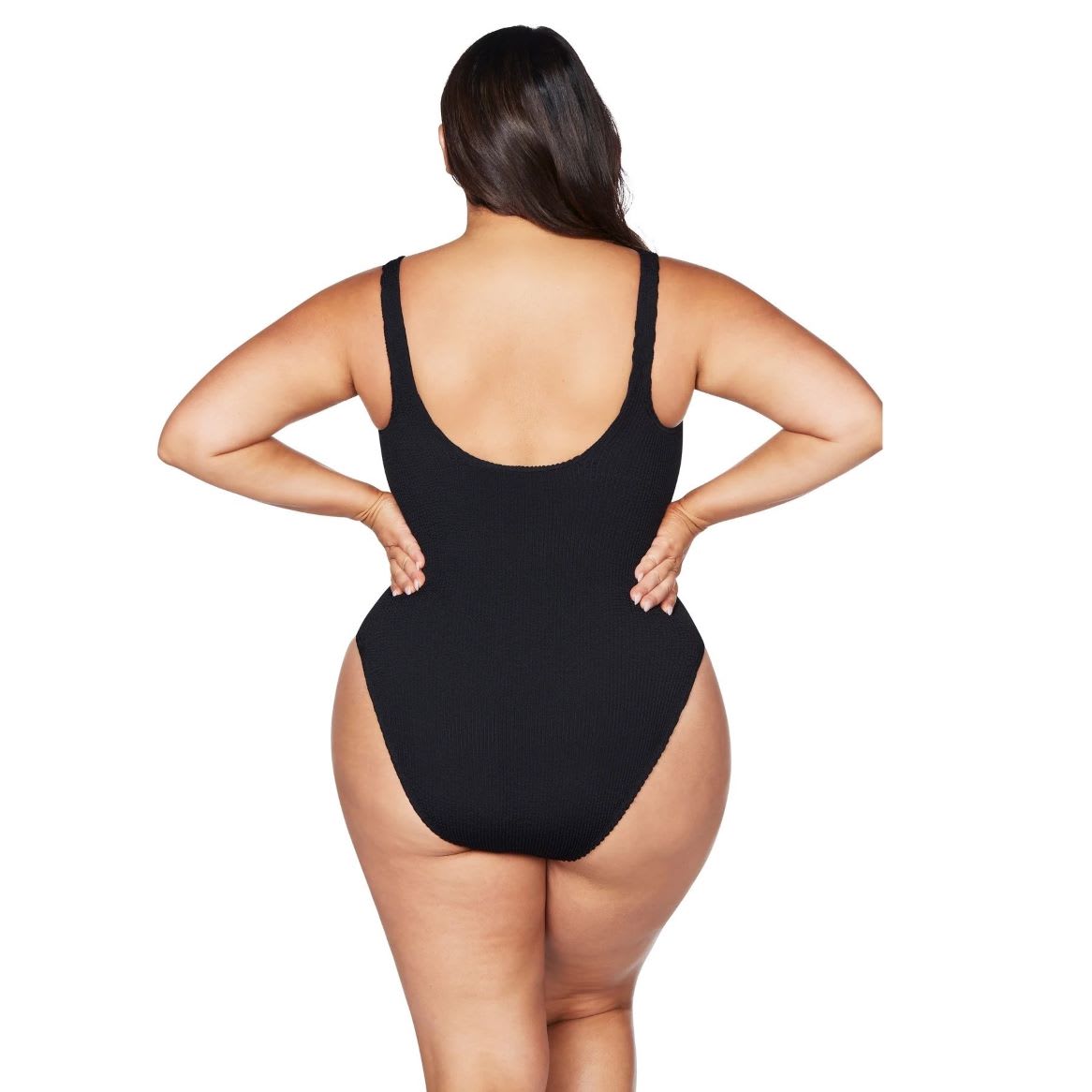 Made from a tubular crinkle knit ‘Kahlo’ is our scoop back basic maillot new shape. This one piece is a sleek long line style with a high cut leg. This is made out of our one size crinkle tubular knit fabrication.