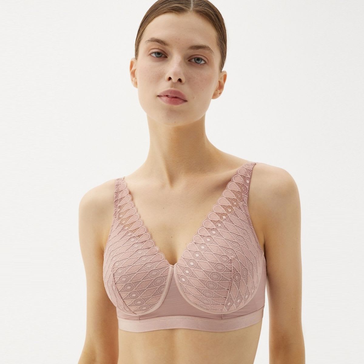 Wire-free design for irritation-free wear. Lightly padded cups offer balanced shaping and volume. Wide back band and straps reduce shoulder pressure and enhance support. Subtle lace detailing adds softness, femininity, and coverage. Designed to fit seamlessly under your favourite clothes.