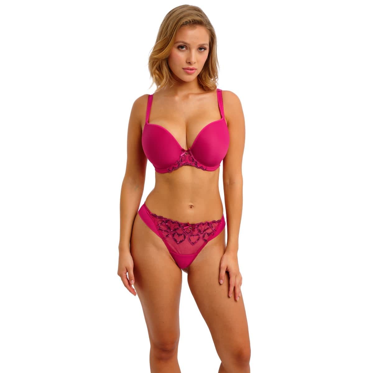 Wrap yourself in the luscious sweetness of Laurine, where vibrant raspberry hues meet irresistible charm. This collection perfectly balances playful and daring with its delicate layered heart embroidery and lightweight mesh design. Featuring moulded cups for a smooth, rounded silhouette and a low centre front for the perfect cleavage without overspill, Laurine offers both style and support. Complete with a powernet wing, fully adjustable straps with a J-hook for racerback styling, and a gold heart charm with a satin bow, Laurine is your go-to for effortless elegance and confidence.