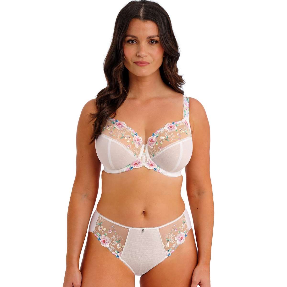 A true celebration of summer, the Lillia bra combines delicate, feminine design with Fantasie’s signature flawless fit. Inspired by an English garden in full bloom, its overprinted embroidery in soft pastels sits beautifully on a crisp white base. The wide wired, three-piece cups with side support provide uplift and forward projection, while the lower centre front creates a flattering plunge neckline. Luxurious printed embroidery adorns the top cups, cradle, and front straps, complemented by a keyhole detail and a metallic charm with gem at the centre front. Powernet wings offer anchorage and support, and fully adjustable soft peach skin shoulder straps ensure a comfortable, elegant fit.