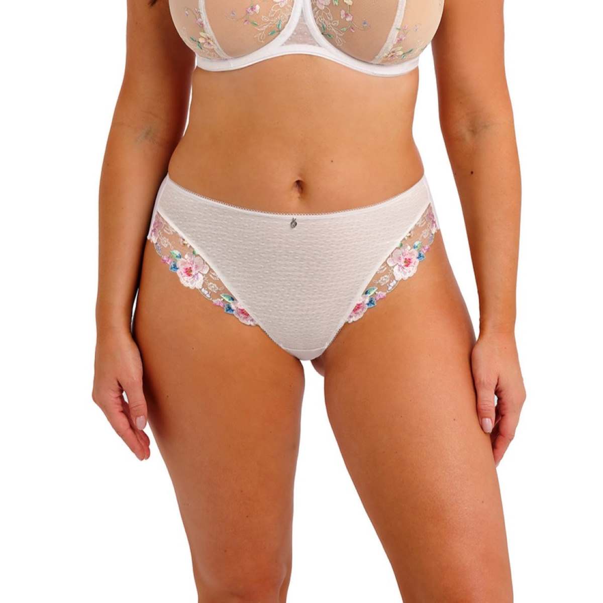 This panty features luxurious printed embroidery at the front leg and a spot mesh front panel lined for modesty and comfort. Crafted from soft-handle, clean-cut fabric, it provides a smooth finish with a second-skin feel and no visible pant lines. A metallic charm with a gem at the centre front adds a delicate, elegant touch.