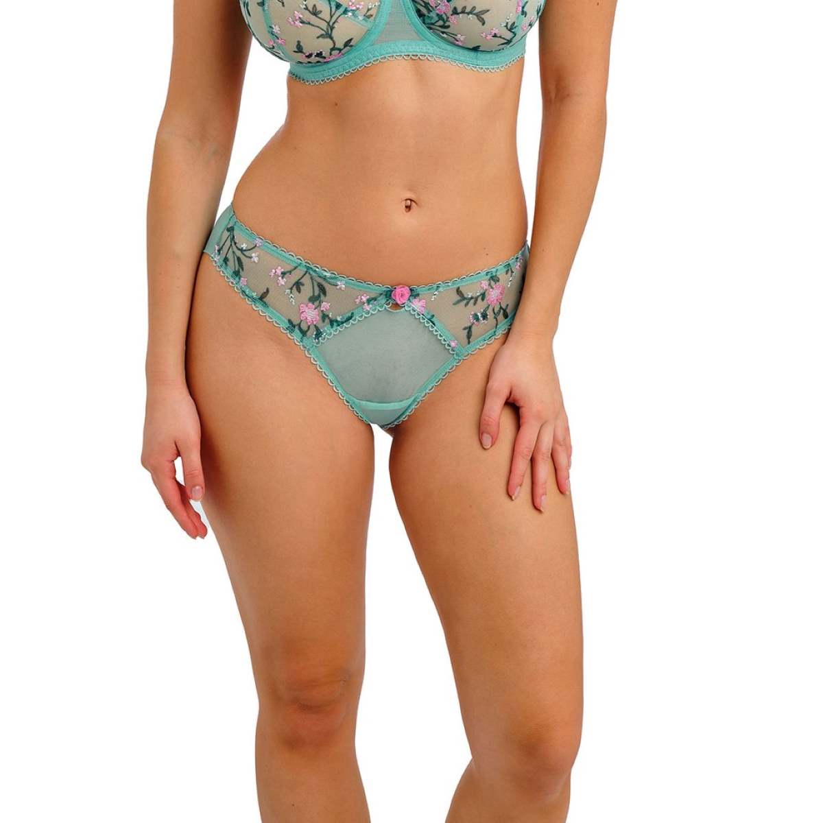 Delicate pink floral embroidery blooms alongside deep aqua leaves across a sheer aqua mesh base, bringing a fresh burst of colour to your summer lingerie collection with Love Crush. Featuring beautiful all-over floral embroidery, this piece is designed with a double-layer mesh back and folded leg edges to create a smooth finish with minimal visible panty line. A playful keyhole detail and dainty pink rosebud charm sit at the centre front, while a cute mini bow at the centre back adds a sweet finishing touch. Pretty contrast picot elastics and a gently gathered back seam enhance shaping and comfort, making Love Crush both flattering and beautifully detailed.