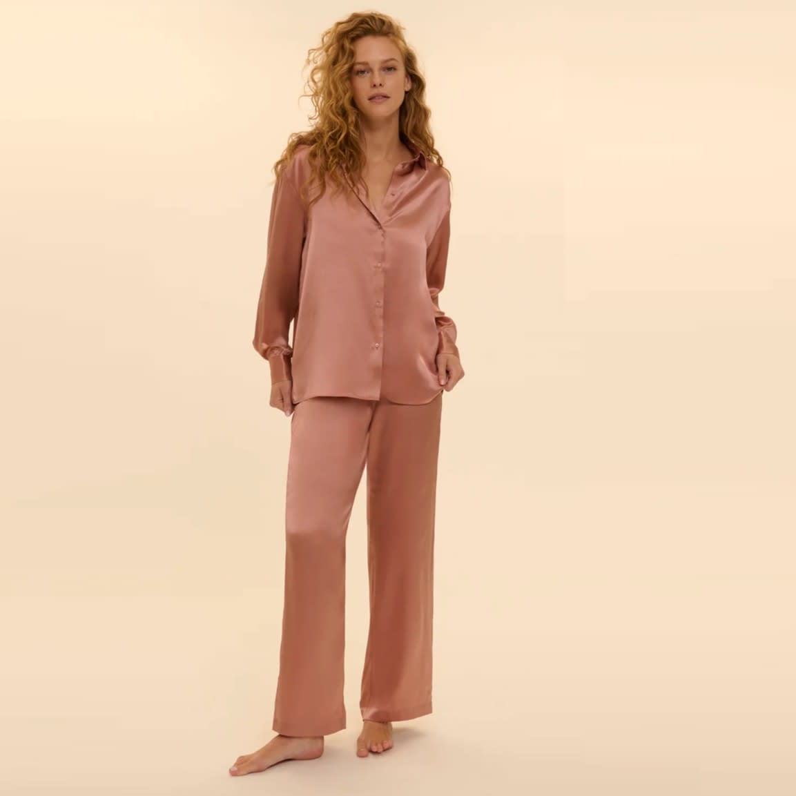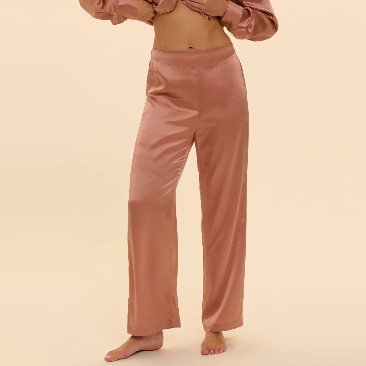Night pant crafted with 100% silk. Flat waistband at front; wide, gathered elastic at the back. Straight-cut for a streamlined look. Wide hem and straight-cut leg.