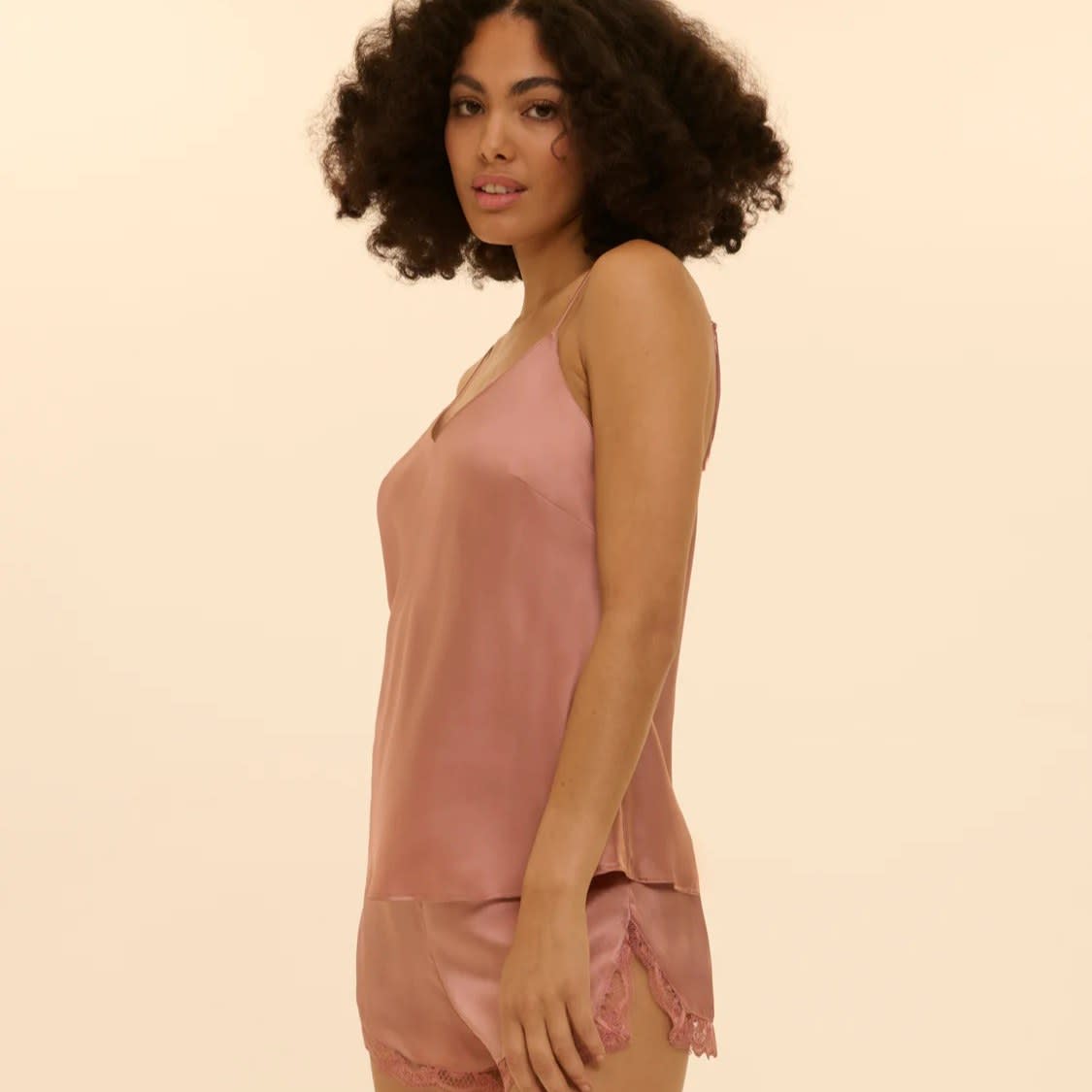 Night short crafted in 100% silk with fine lace edging. Flat waistband at front; wide, gathered elastic at the back. Embroidered lace details along the sides of the short. Stylish thigh slits enhance ease of movement.