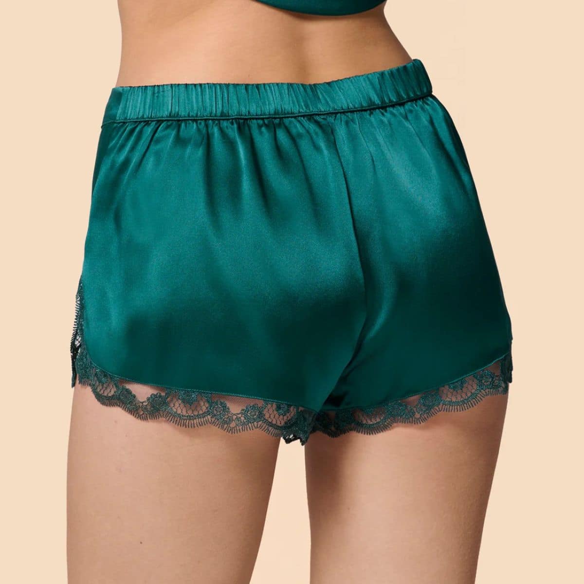 Night short crafted in 100% silk with fine lace edging. Flat waistband at front; wide, gathered elastic at the back. Embroidered lace details along the sides of the short. Stylish thigh slits enhance ease of movement.