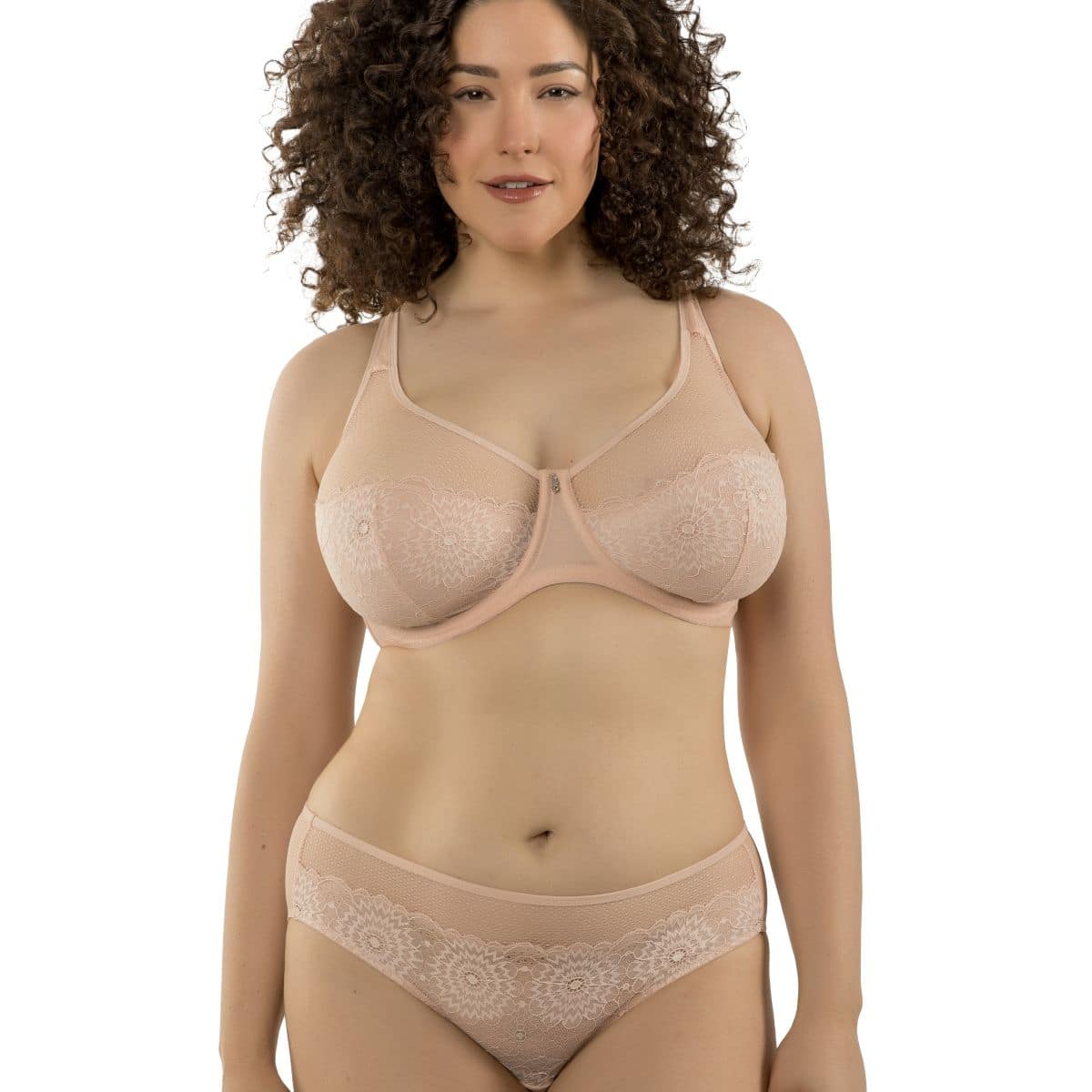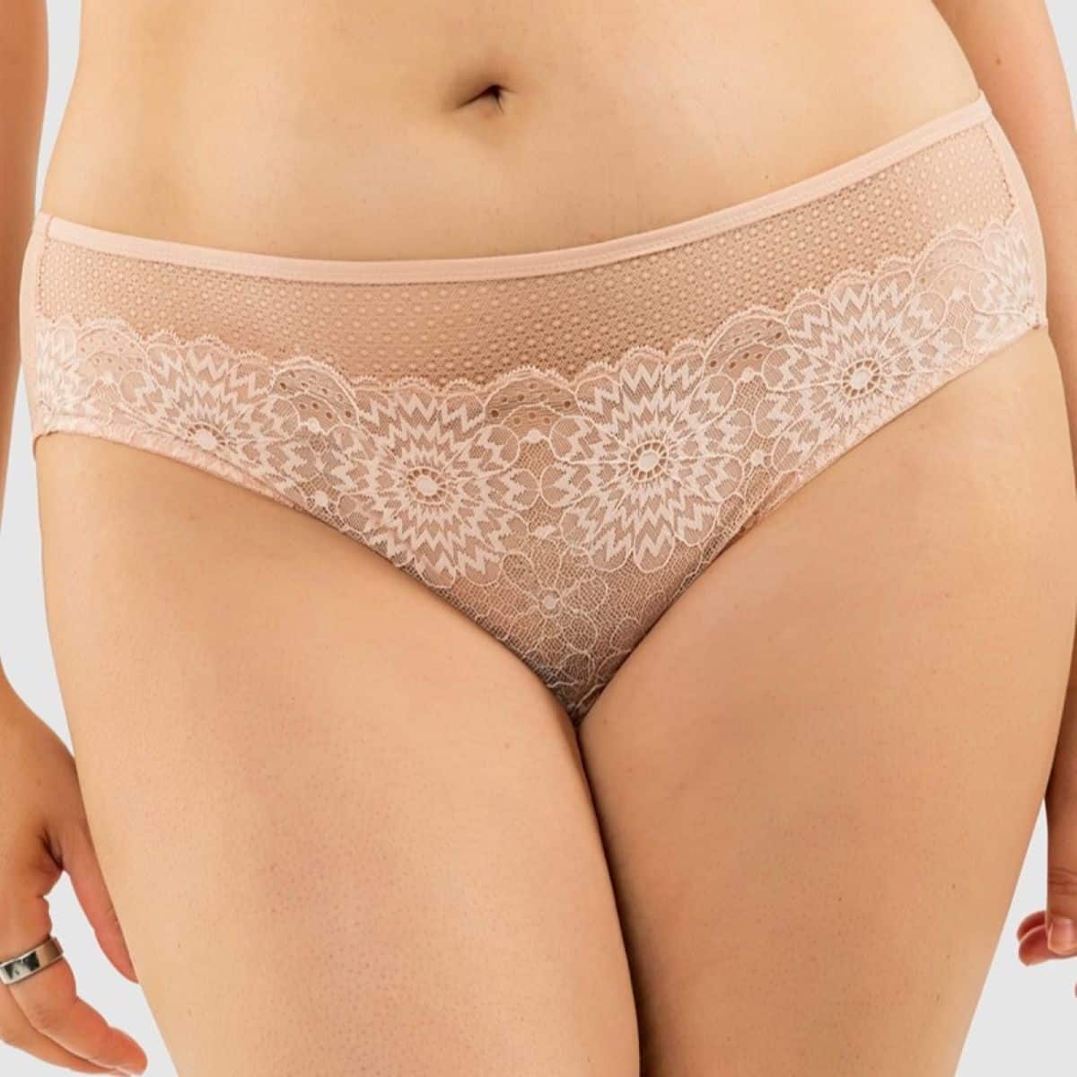 Low waist hipster brief. Sheer patterned mesh and abstract floral mesh. Soft, comfortable elastics.