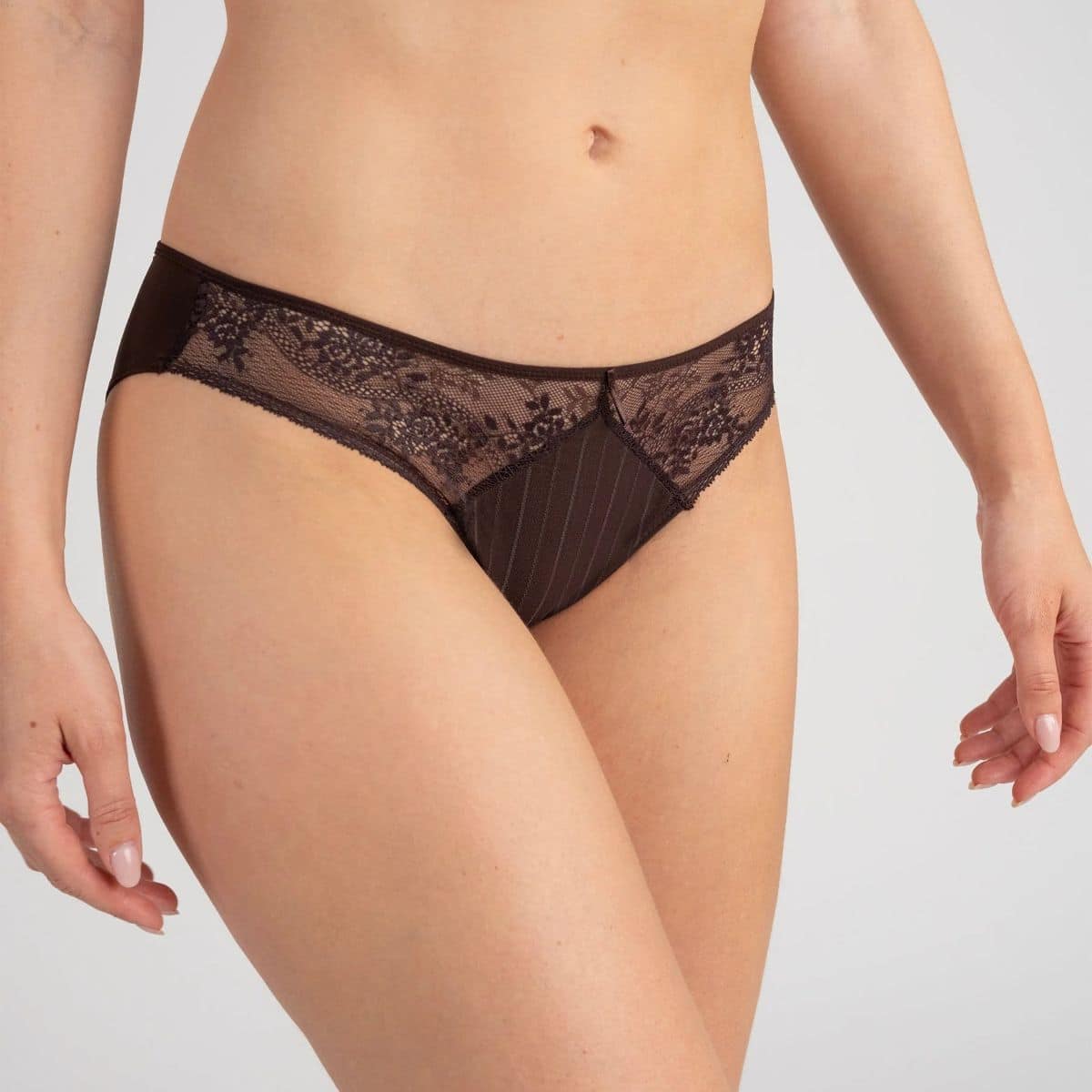 A comfortable brief, with a very feminine look. The signature details: panties on the front that combine the softness of cotton on the inside and striped tulle on the outside. Floral lace overlaps delicately dress the sides. A back made of soft and smooth microfiber, with perfect coverage