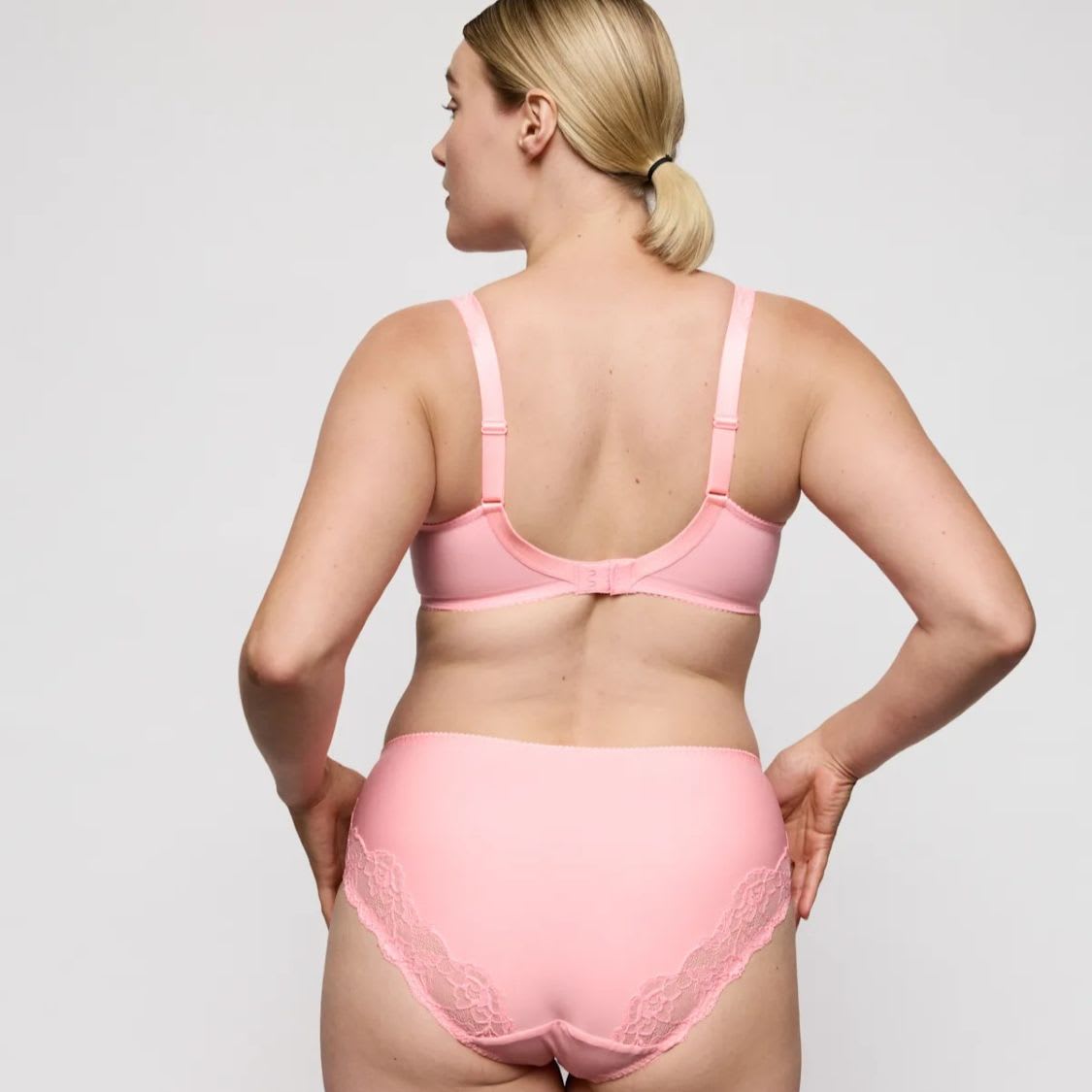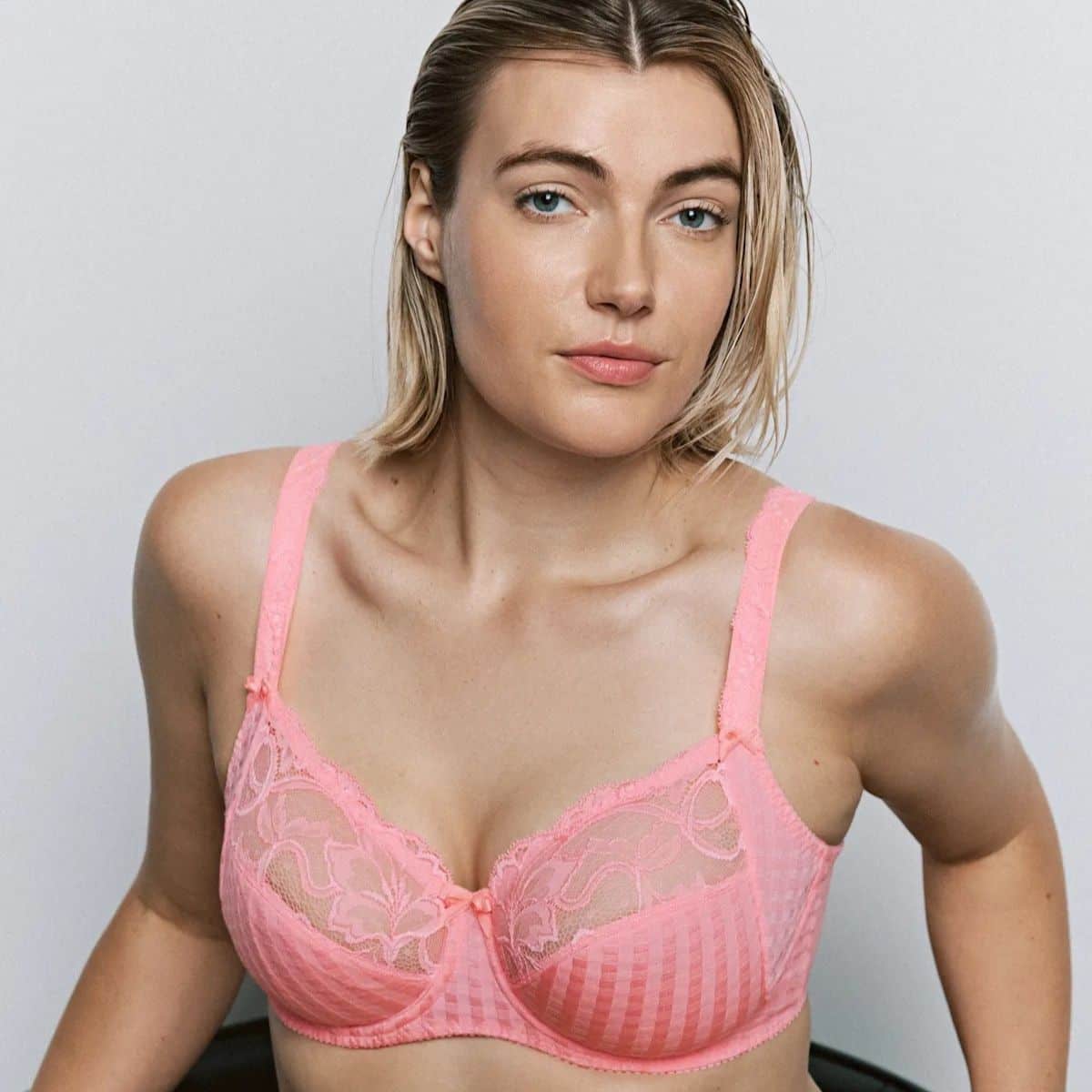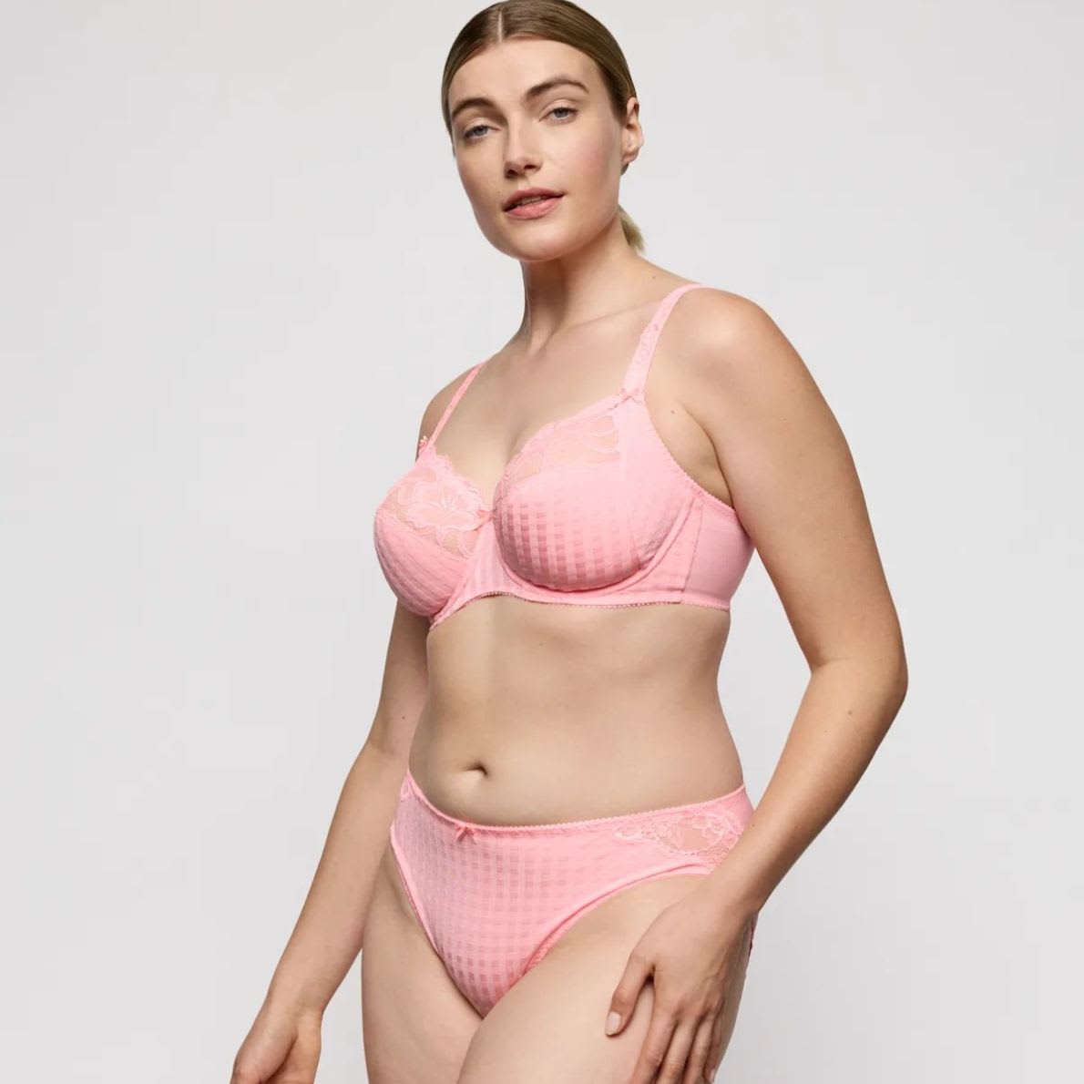The PrimaDonna Madison Full Cup Bra is a three-section underwired bra with a fantastic fit and great shape. The top of the cup features stretch lace that hugs your curves and the checked pattern on the lower cups gives a youthful look. The sturdy cups lift the breasts, which are also centred by the side support. The cups are quite deep, which ensures better uplift for larger breasts, shaping them to create a smooth, round look.