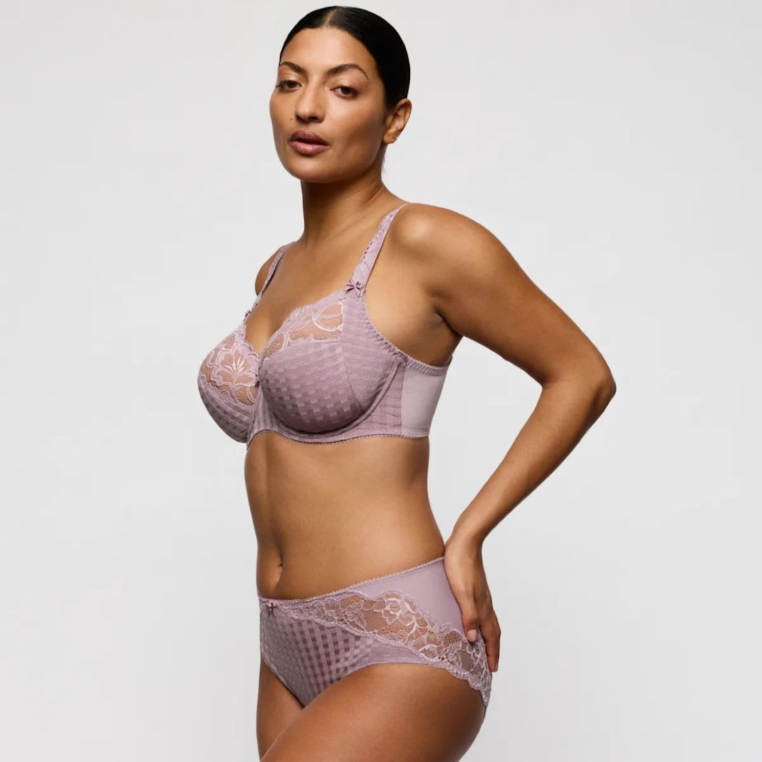 High-waisted Madison Satin Full Briefs in a checked fabric feature a luxurious semi-sheer lace trim that starts at the hips and continues downwards to frame your curves. These elegant and comfy briefs offer full rear coverage.