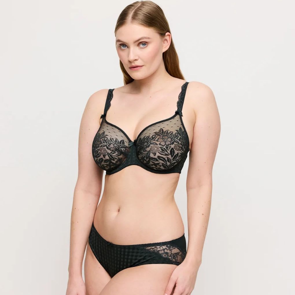 Introducing the Madison Seamless Non Padded Bra, a romantic and supportive sheer bra that combines comfort and trendiness. This exquisite full-cup bra features seamless, heart-shaped cups made from French lace, adorned with a retro floral print. The lace-adorned straps add an extra touch of elegance. This bra is a must-have addition to every lingerie drawer. Experience the perfect blend of airy comfort and captivating style with this delightful lingerie piece.