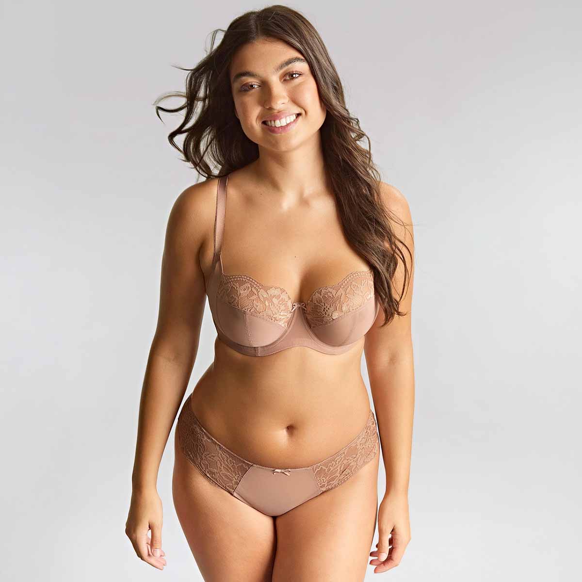 A 4 Piece Balcony bra with rigid, unlined bottom cups offers a bold, sheer look. Powermesh wings provide firm and comfortable support around the body, all the way up to a K cup. New sophisticated and feminine lace using recycled yarns