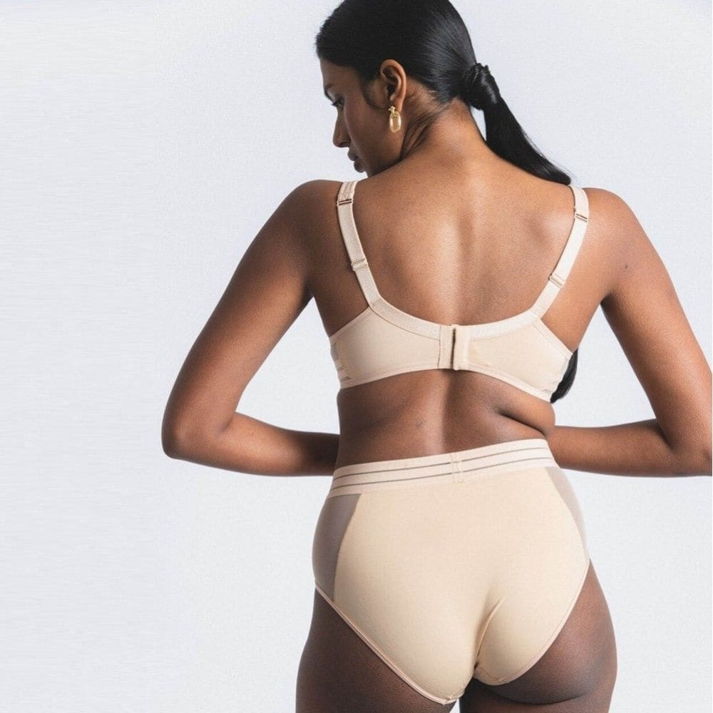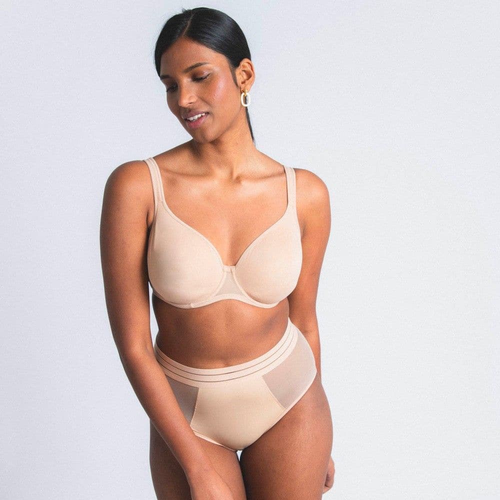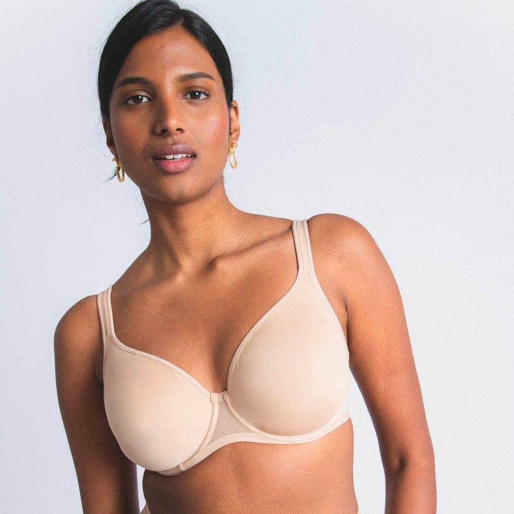 This moulded cup bra is made with opaque knit fabric. It has Voile fabric between cups for lightness and lined for support. The wide shoulder straps with a padded interior construction give extra support. The sides are veil enhanced with an elastic tri-band accompanied with a knit fabric on the back with silicone strips inside for more support.