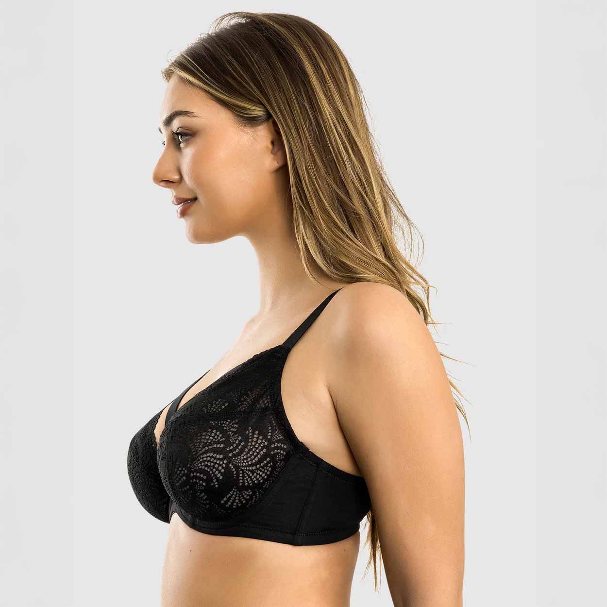 Make a bold impression in the Olivia Unlined Lace Plunge Bra. Designed especially for fuller busts, this daring bra features unpadded lace cups with a fan-motif and scalloped edge. The 3-part cup seaming provides superior support and shaping, while fashion-forward strappy accents frame the neckline to create a striking cut-out effect. For even more support, the adjustable shoulder straps include a convenient J-hook to optionally convert it to a racerback.