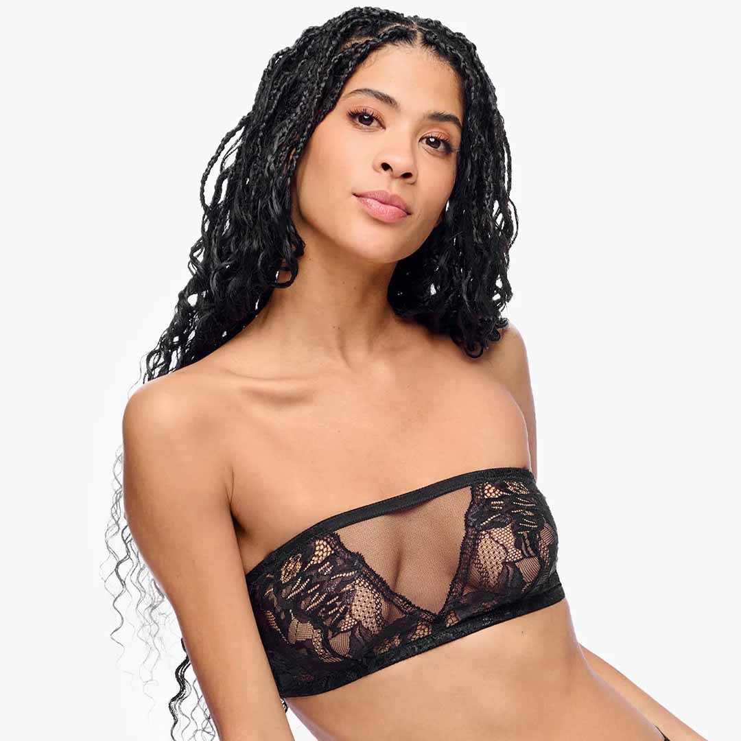 This wireless Paradiso Bandeau Bra is designed as a chic fashion layering piece, featuring a transparent plunge front for a modern, feminine touch. Crafted from semi-sheer tricolor lace with a delicate scalloped edge, it offers a beautifully detailed finish. The non-padded cups are lined at the front with power mesh to provide gentle support and subtle coverage. Designed in a convenient pull-on style with adjustable, removable straps, it offers versatile styling options. Silicone grips along the top and bottom help prevent slipping, while side boning ensures added support and structure. Hand wash only; do not dry in the dryer to preserve its delicate lace and fit.