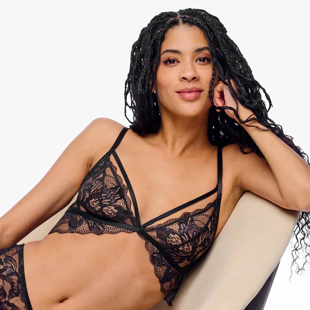 This wireless Paradiso triangle bralette is designed as a chic fashion layering piece, combining comfort with delicate style. It features semi-sheer tricolor lace with a beautifully scalloped edge, creating a soft and feminine look. The non-padded, unlined triangle cups are accented with a front strap detail that adds a modern touch. A hook-and-eye closure at the back ensures a secure fit, while adjustable straps with decorative hardware provide a customizable and elegant finish. Hand wash only; do not dry in the dryer to maintain its delicate lace and shape.