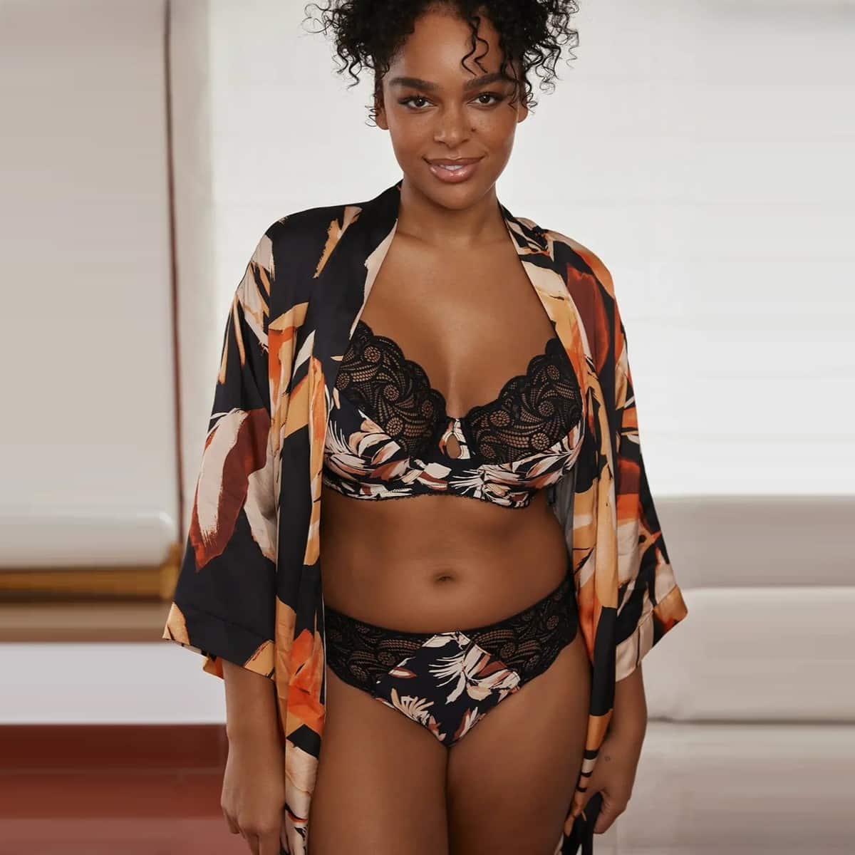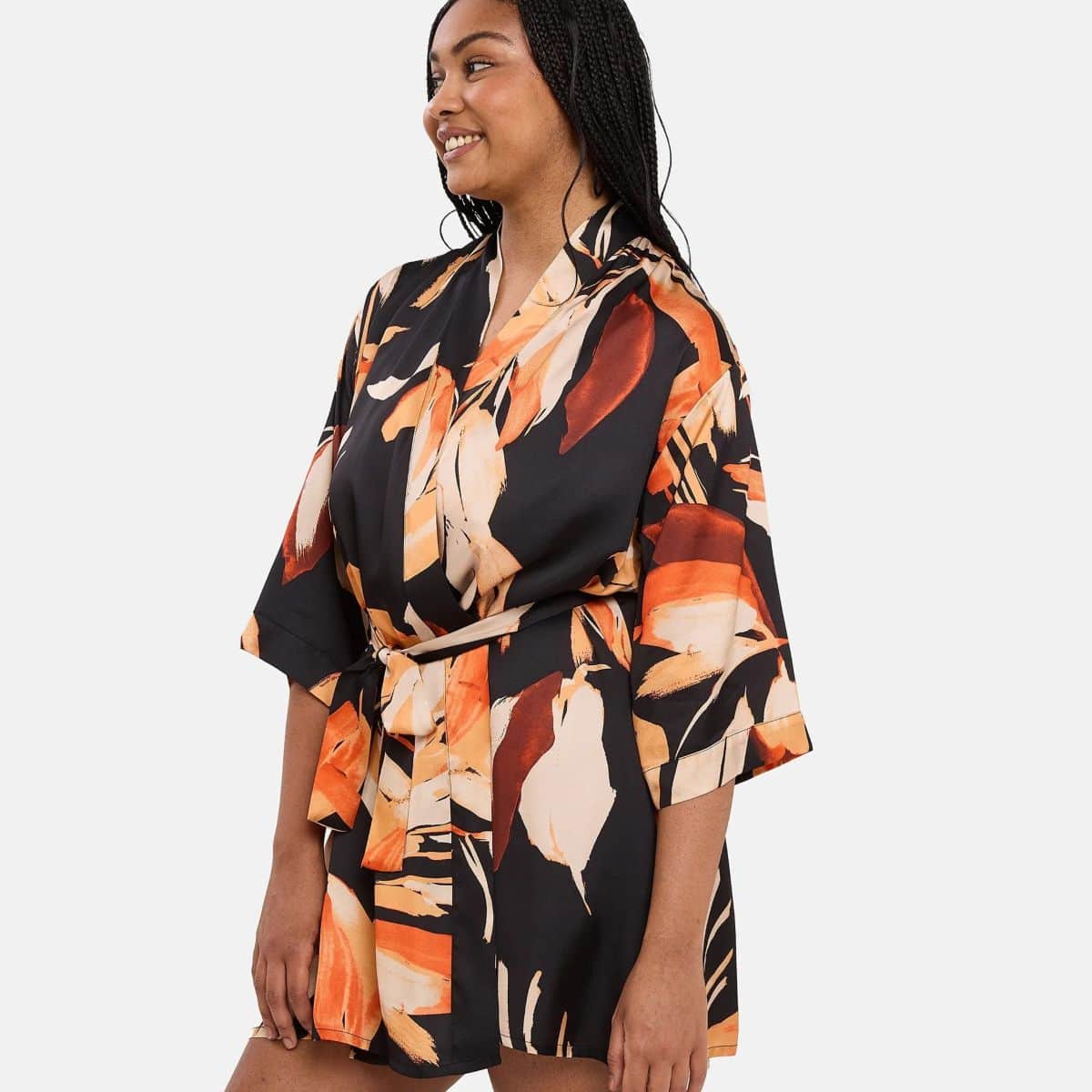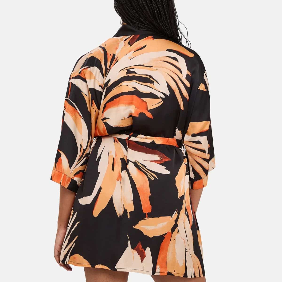 Adopt a trendy and feminine style with the Pure Chic line and its satin effect that is very pleasant to wear daily. • Trendy floral print • Ultra soft and comfortable viscose satin • 3/4 sleeves • Waist tie belt