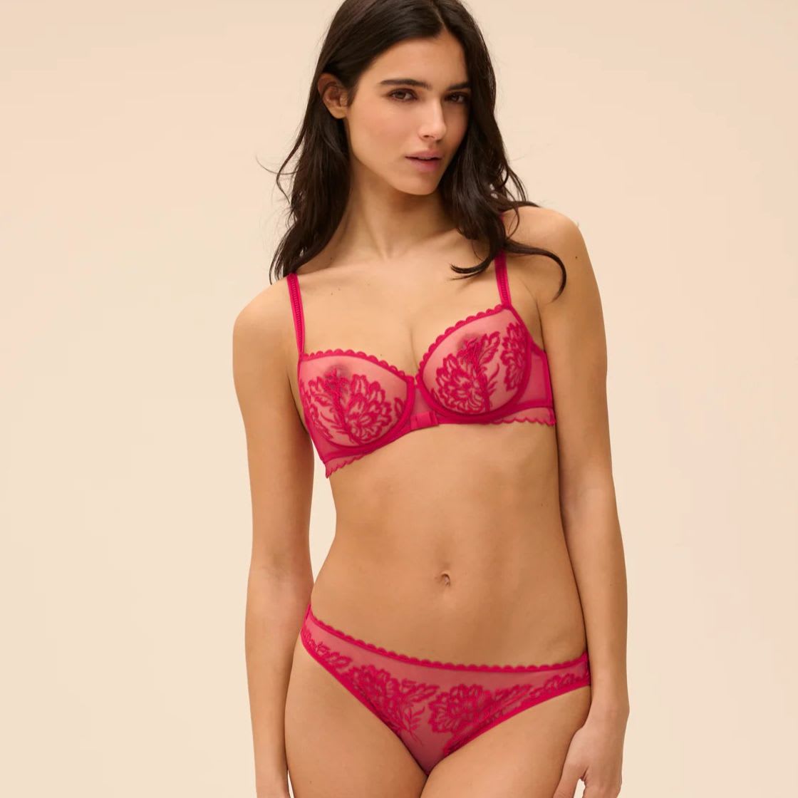 Bikini brief in embroidered tulle and stretch knit. Tattoo-effect floral embroidery on sheer front. Clean-cut back in soft, seamless knit fabri. Waistline finished with delicate scalloped trim. Invisible under clothing. Lightweight and breathable design. 100% cotton gusset.