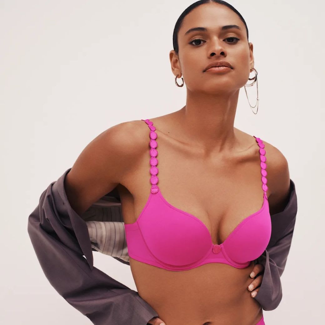 The Tom Heart Shaped Bra from Marie Jo is a Padded bra with heart-shaped cup. The cup covers much of the breasts at the top. The high neckline runs above the breasts, plunging deeply between them. With a straight back in transparent tulle. The straps can be worn over the shoulder or round the neck.