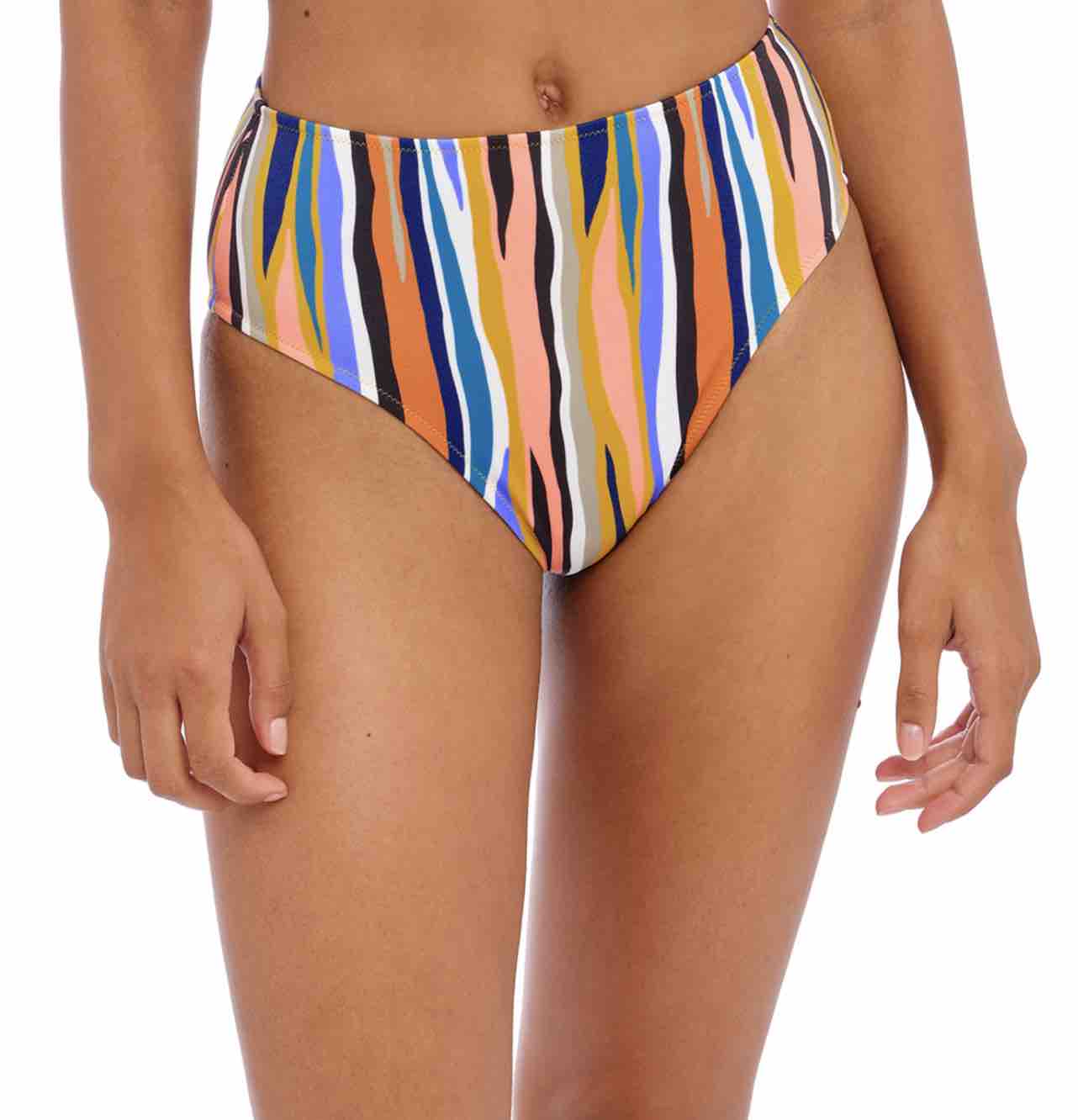 Stripes lead the way in Freya's Torra Bay High Waist Bikini Brief featuring a medium bottom coverage style that sits high on the waist with a flattering scoop leg line.